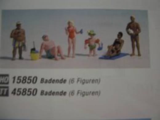 The set for H0 gauge (scale 1:87, approx. 2 cm high) consists of three men, two women and a small child. The bathers wear typical swimwear such as swimming trunks and bikini and are depicted in various scenes: For example, a man in yellow and blue striped swimming trunks sitting relaxed in a folding chair, or a child with water wings playing with a small toy fish in the water. This set is ideal for the realistic design of swimming and leisure scenes on your model layout.