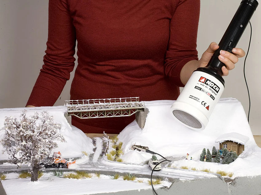 First of all, the surface is perpared with the NOCH Snow Glue (ref. 61138). Then the Snowflakes are applied with the NOCH Grass Master 2.0 (ref.60135) or the NOCH Grass Spray Tube (ref. 08100). Almost magically, a silky, shimmering layer of snow appears, which resembles fresh powder snow.