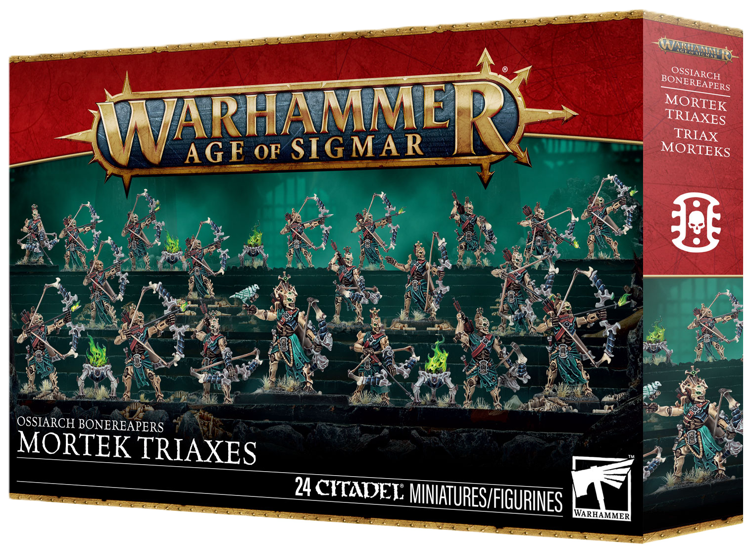 This multipart plastic kit builds 20 Mortek Triaxes and four Balefire Braziers for your Ossiarch Bonereapers armies in games of Warhammer Age of Sigmar. The kit includes parts to build up to two optional champions, each in one of two different poses. There are also 20 interchangeable heads, 16 interchangeable quivers, and 4 interchangeable flames for the braziers, making it easy to customise your ranged infantry.
