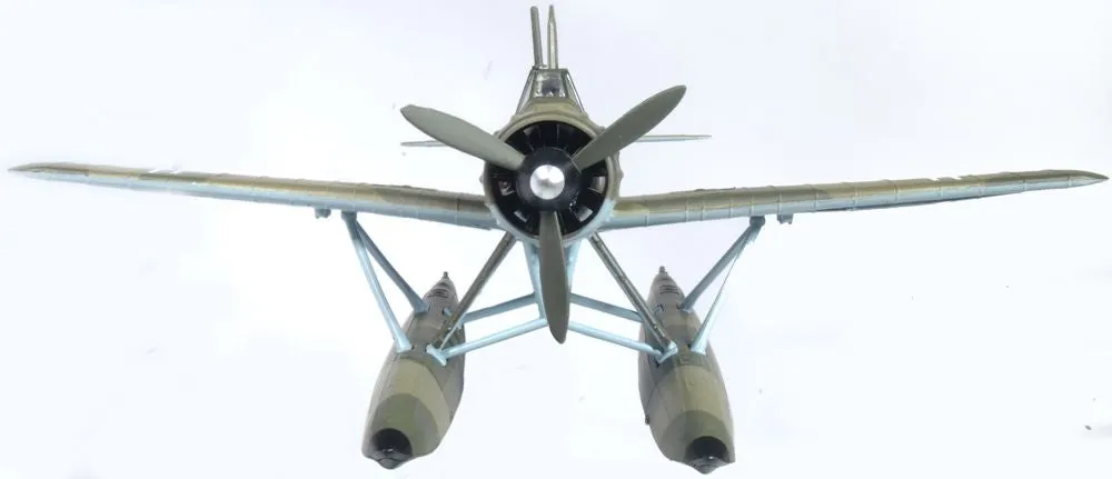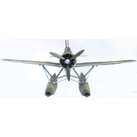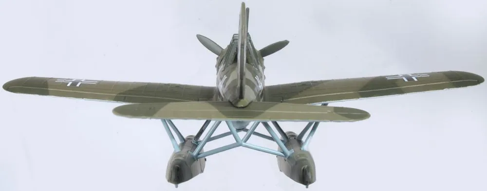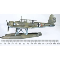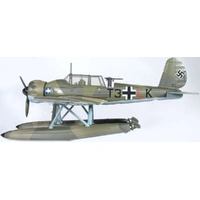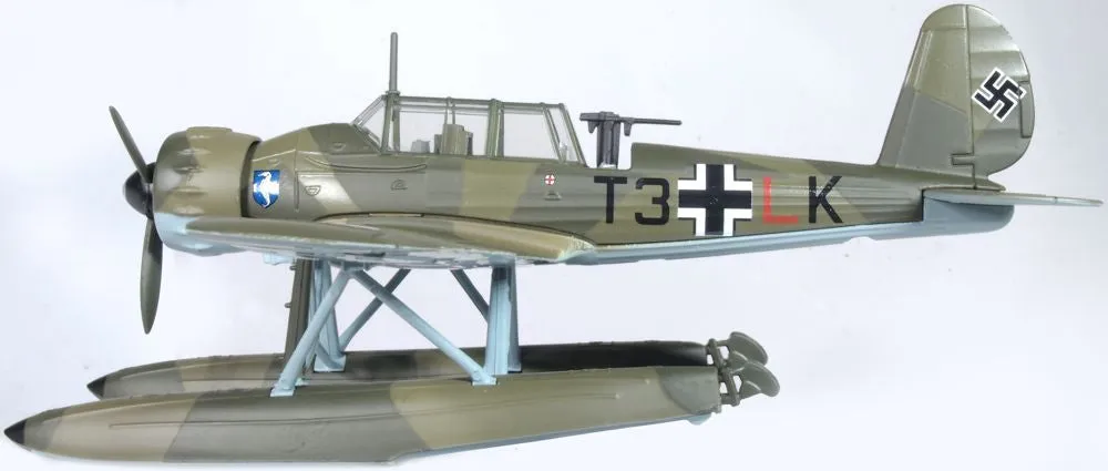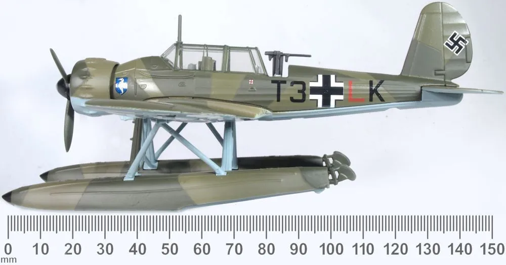 The Arado was a German reconnaissance seaplane, which served aboard many of the famous German Navy ships of the day, including Graf Spee and Bismarck. Designed by Walter Blume, over 500 were built by the Arado company between 1939 and 1944. The Arado AR 196 was a great success and loved by its pilots for its easy handling both on land and water. The German Air Ministry had put out a request for a successor to the He 114 with a specification that included a capability of operating on both land and sea. Arado was the only designer/manufacturer to come up with a low wing monoplane as opposed to their competitors’ bi-planes. A resultant four prototypes were ordered initially. Our 1:72 model is as deployed on board the Bismarck in 1941, wearing a two-tone green drab camouflage to the upper body and the duck egg blue underside. The floats are decorated similarly. Black and white Luftwaffe markings appear on both sides of the fuselage between the T3 LK lettering, while the German Swastika is printed on the tailfin. A tiny little detail sees a seahorse printed on a blue shield-shaped background just behind the engine cowling. Another fine detail sees the engine interior behind the nose cone and propeller blades finished in black. Scale 1:72 scale means that this is 72 times smaller than the full sized vehicle(s) For a much more detailed explanation of scale and the history please follow this link .