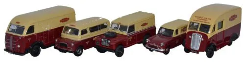 Railway enthusiasts of the 'blood and custard' era of British Railways can add a whole station yard full of 00 gauge models with this set of five authentic utility vans. Each has been released separately in the past so if you missed them last time, don't delay second time around! The set comprises: 76AK016 Austin K8 - British Railways Registered NXW 134 in the traditional pale cream and crimson colour scheme, this little utility van is decorated with the British Railways totem on either side in red/silver on the cream ground. The interior of the vehicle is black. Additional black and silver masking completes the detail including the minute Austin marque above the rear bumper. 76CA018 Bedford CA Minibus- British Railways Probably used for transporting railway crew members in real life, our crimson and cream Minibus is registered NRO 522. Distinctive lettering includes the British Railways totem in crimson out of cream above the windscreen; and cream on a crimson ground along the lower sides. The vehicle's fleet identity CA8276 E is printed on the cabin doors and the Bedford marque in black runs the length of the silver front bumper. 76CM001 Commer Q25 - British Railways Continental Service The Commer Q25 was launched into our 00 scale railway series with this livery, as used by British Railways to link the UK with other parts of Europe. Our model, registered OGT 65, is advertising its Day and Night services for Harwich and the Continent as the lettering above the driver's split windscreen displays. The BR totem is printed above the non-opening back door as well as along the upper sides of the vehicle. The door handles, headlights and radiator grille are all silver. 76LAN2001 Land Rover Series II Hard Top - British Railways Our long wheelbase Land Rover makes a useful support vehicle and here we see it in the hard top version registered BBH 942B from 1964. Once again the upper body is pale cream and the lower section crimson with depot lettering B1347 S on the cabin doors. Note the spare wheel on the front of the bonnet and the instantly recognisable Land Rover radiator with satin black masking behind the grille. 76ANG037 Ford Anglia Van - British Railways The livery decorating this release of our Ford Anglia Van is a replica of a Parcels Delivery Service vehicle, registered JBV 308F from 1967. The Anglia, with its distinctive front quarter lights and signature chrome radiator grille really looks the part in the 'blood and custard' colour scheme. Note that the crimson lower body colour is repeated on the wheels, finished off with silver hub caps. Dimensions and Weights Packed: 22.7cm x 9.2cm x 4.9cm ( L x W x H ) Unpacked: 6.2cm x 2.5cm x 3.5cm ( L x W x H ) Excludes shipping carton Scale 1:76 scale means that this is 76 times smaller than the full sized vehicle(s) For a much more detailed explanation of scale and the history please follow this link .