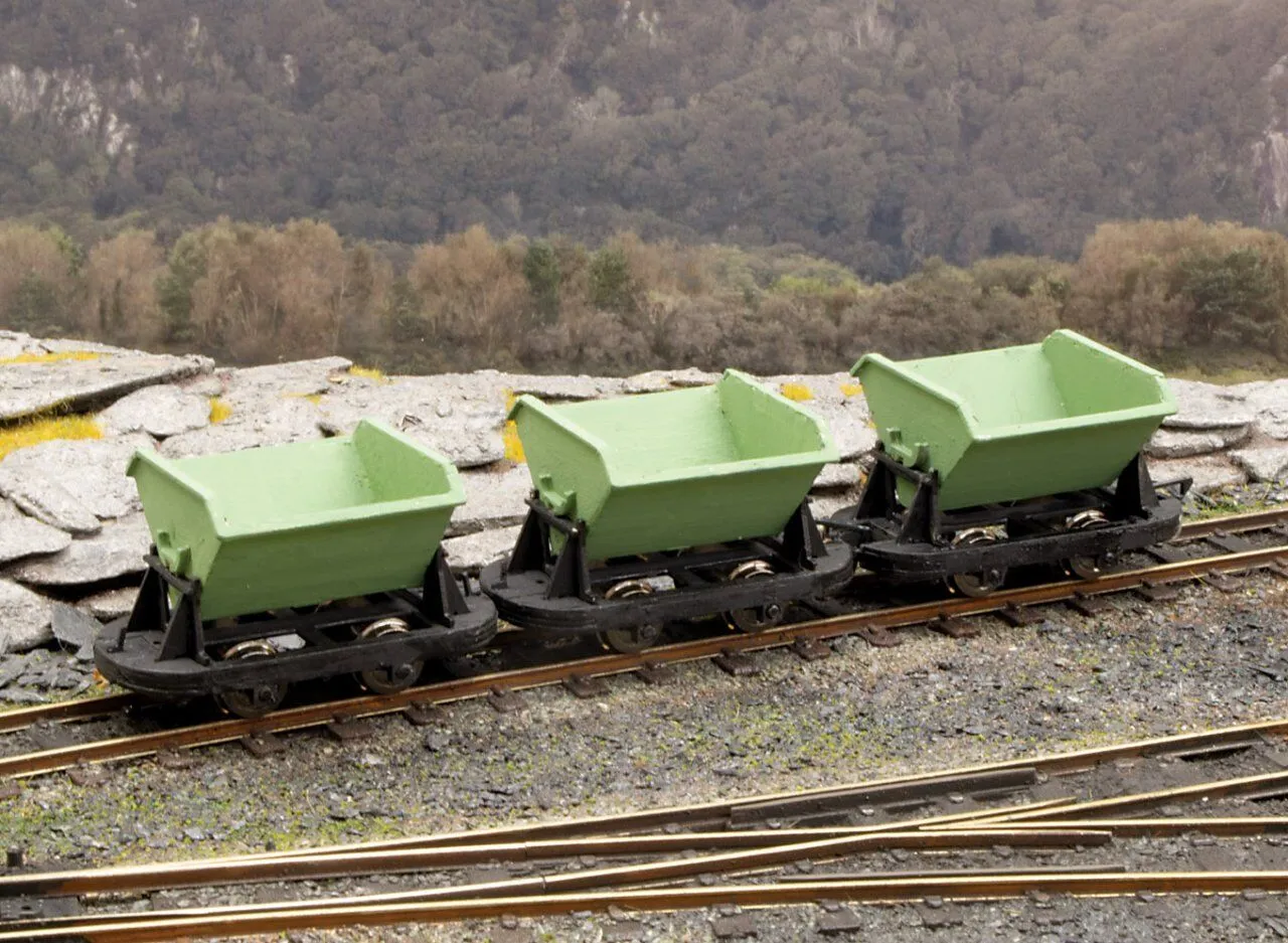 Laser cut wagon kit of a 4-wheel narrow gauge V-Skip wagons found at many industrial locations. Tipper body can be left loose to enable it to tip prototypically. Features metal disk wheels that run freely in brass bearings. Contains plastic tension-lock couplings and NEM pockets. Options for omitting couplings completely or fitting them integrally to the wagon chassis for prototypical close-coupling. Pack of 3 wagons.