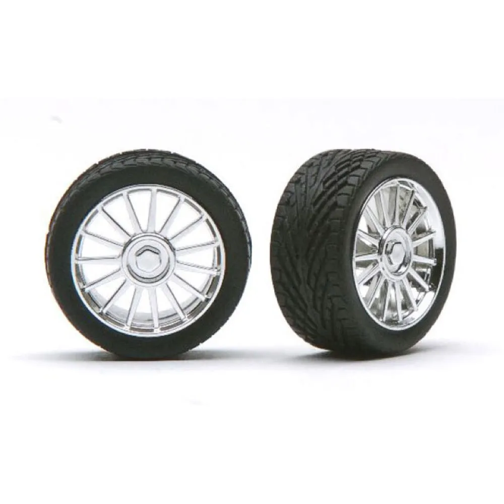 This is a series of accessories parts for 1/24 car models from Pegasus Hobby. Widely used for remodeling, customization and detail enhancement of car models. Features This set includes 1/24 scale car model tires and 4 wheels. The wheels feature 15 thin spokes for a delicate design. Each spokes is sharp. The wheels are approximately 20mm in diameter, and are beautifully chrome plated with a shiny finish to enhance your dress-up effect. This is a larger type with a plus offset, and the depth of the spokes from the back of the wheel to the back of the wheel. The back center bearing has a hole for the shaft about 2mm inside diameter. The tread pattern is also delicately reproduced. The realistic texture is also attractive. The tire size is a flat type with outer diameter of about 0.9 inches (24 mm), width of about 0.4 inches (11 mm), height is about 0.08 inches ( This wheel and tire set is perfect for modified parts to customize the foot of your car model.