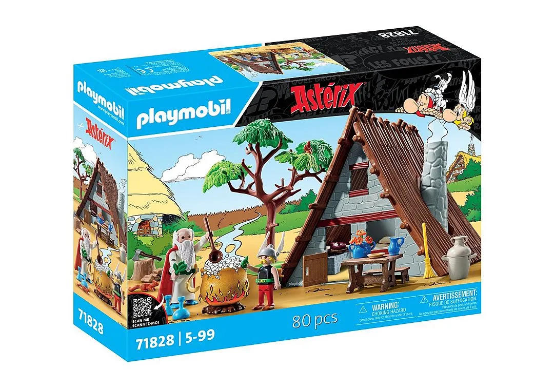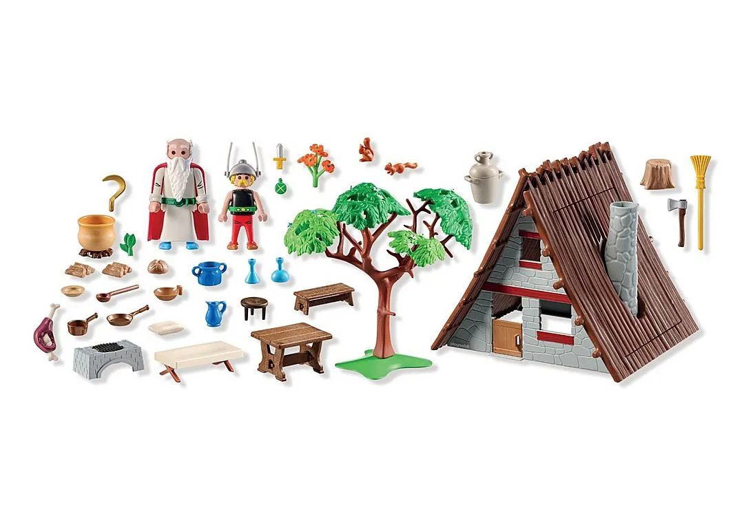 Accessories: Asterix hut, 1 Asterix helmet with wings, 1 drinking bottle, 1 dagger, 1 belt loop, 1 stool, 1 bed, 1 pillow, 1 wooden table, 1 cooking area , 1 pan set, 1 broom, 1 bench, 1 chopping block, 1 axe, 2 logs of wood, 1 bread, 1 plate, 1 bowl, 2 pans, 1 flower bush, 1 tree, 1 kettle, 2 bottles, 1 soup spoon, 1 sickle, 1 cape
