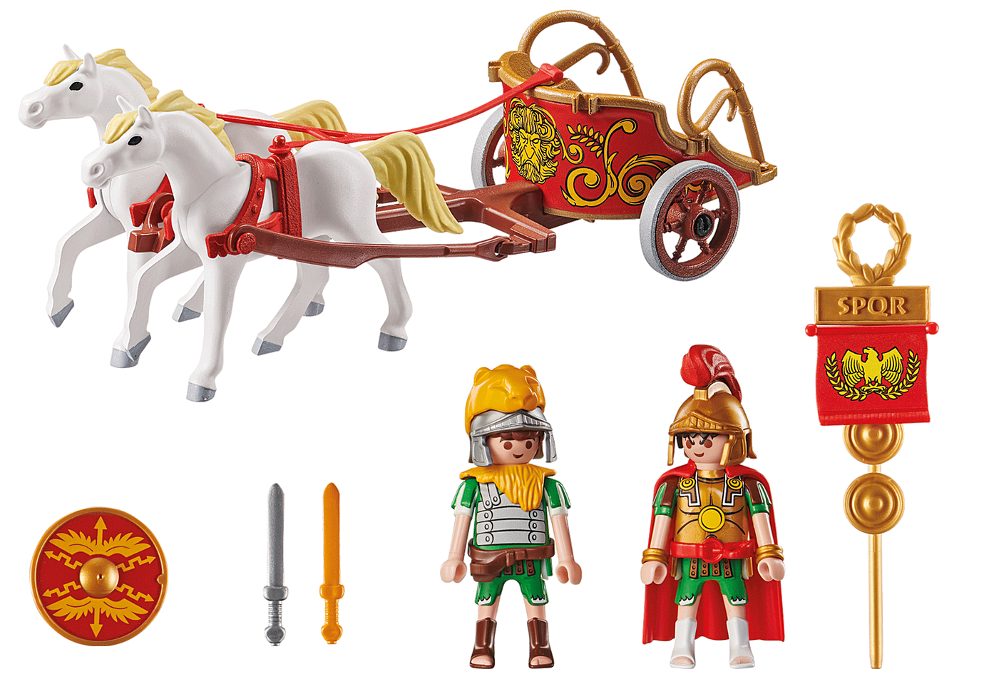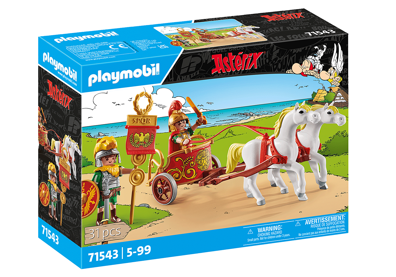 • Lovingly designed toy set from the PLAYMOBIL Asterix world, featuring Senator Brutus and another Roman soldier, two horses, a chariot, helmets, shield, standard, and many other extras for imaginative role-playing in the playroom.