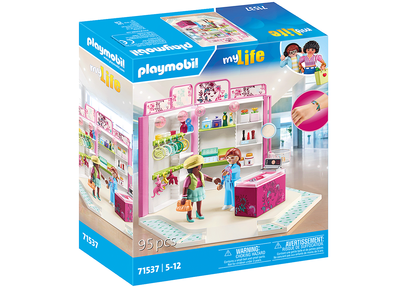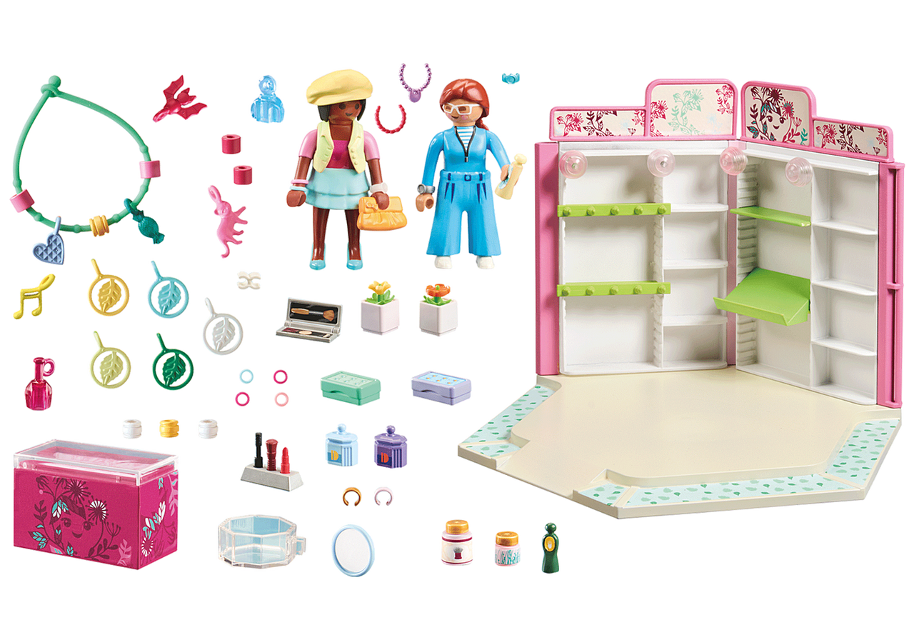 • Lovingly designed beauty store with two PLAYMOBIL figures, display case, boxes, bracelets, flower stars, lipstick, and many other makeup and jewellery accessories.