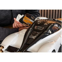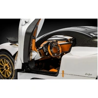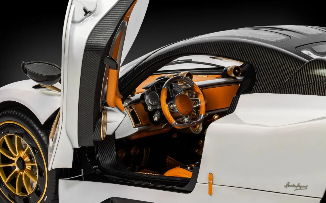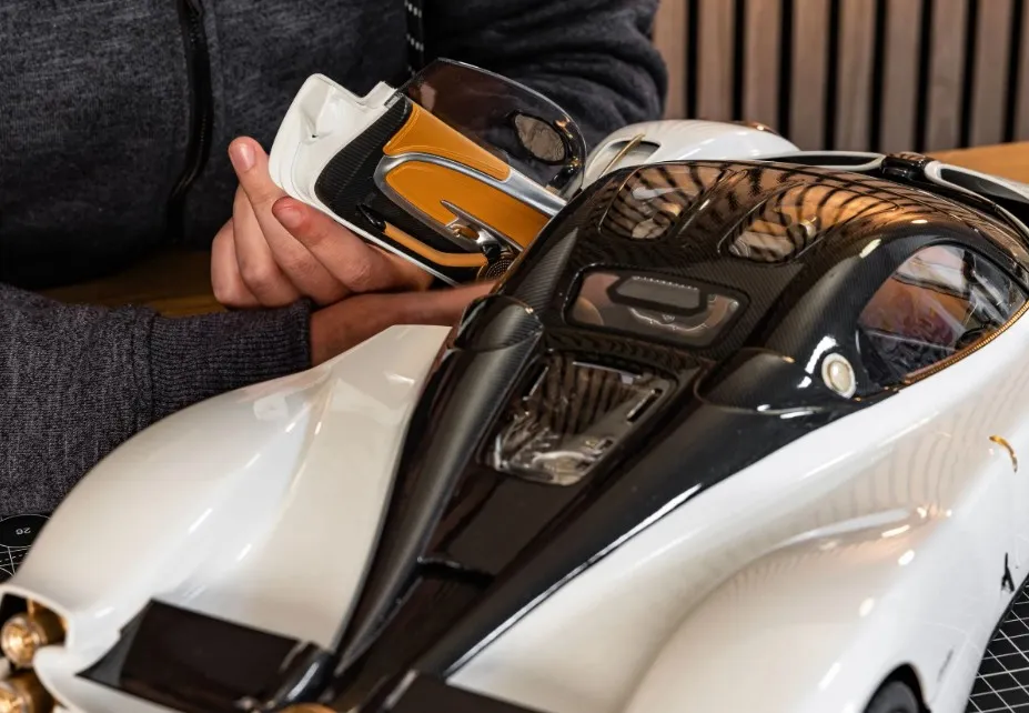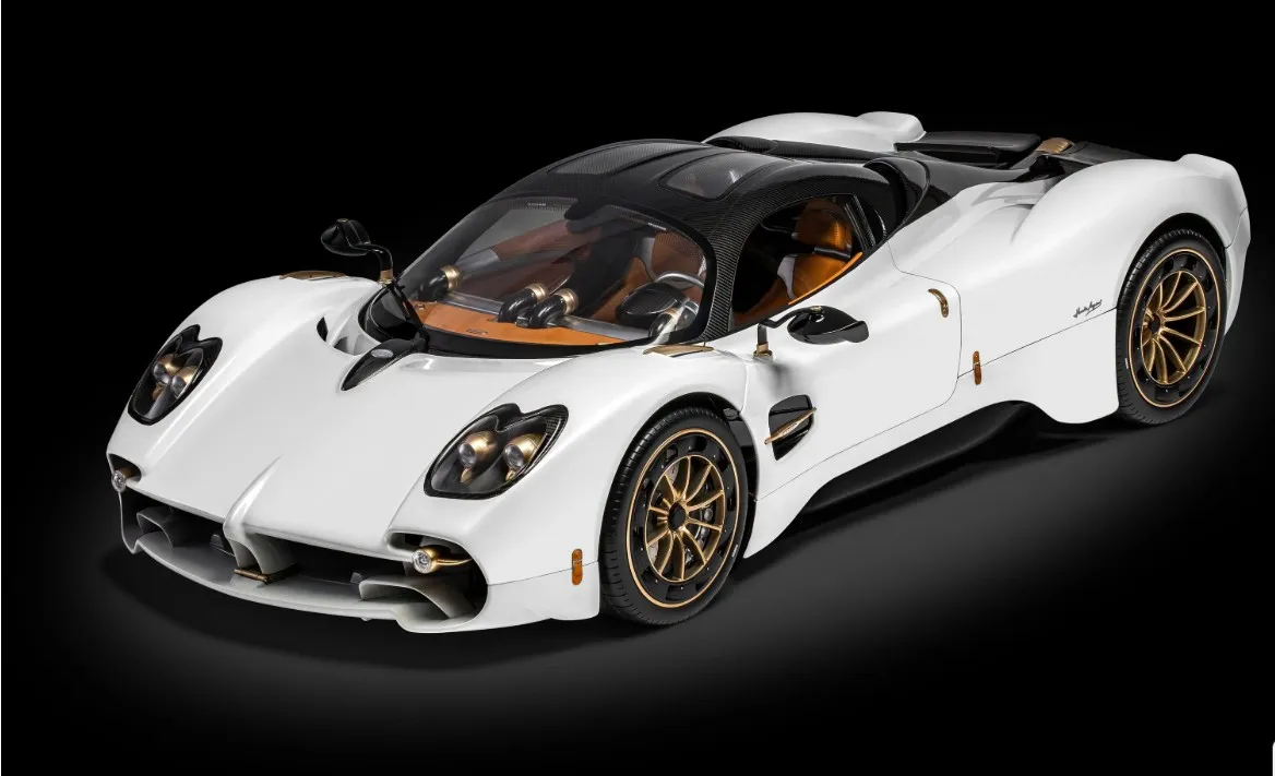 Comprising over 556 precisely engineered parts, the model reflects the artistry and vision behind Horacio Pagani’s latest creation. From the hand-finished tan leather interior and striking carbon fibre accents to the polished aluminium detailing and powerful V12 engine, every element has been faithfully recreated using premium lightweight materials.