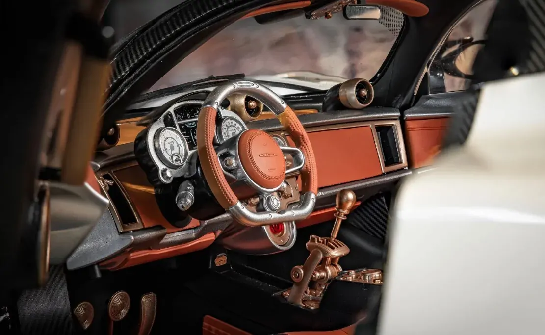 Pagani sets the benchmark for opulent interior design, and the Utopia’s cockpit is no exception—a true work of art that perfectly balances luxury, style, and practicality while embodying the hypercar’s dynamic performance and elegance. The model mirrors this with meticulous detailing throughout, showcasing hand-stitched leather textures, intricate carbon fibre patterns, and sculpted aerodynamic forms.