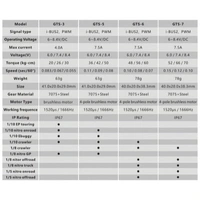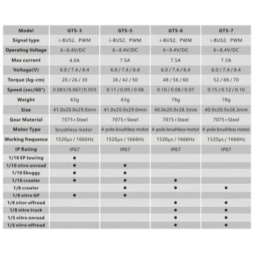 The Power HD GTS-5 HV CNC Brushless Digital Servo (HD-GTS-5) delivers outstanding torque and speed in a low profile form factor. Offering up to 50.0 kg-cm torque with a 0.08 s transit time at 8.4 V, it is built around a four-pole brushless motor, dual ball bearings and 7075+steel gears for fast response and long service life. The GTS-5 supports FLYSKY i-BUS2 for servo parameter setup, data logging and warnings, and works with the high-speed modes of leading radios. Features - HV CNC brushless digital servo with four-pole brushless motor - Low profile size: 41.0 × 20.0 × 29.0 mm - Supports FLYSKY radio i-BUS2 protocol for setup, data logging and warnings - Supports high-speed radio modes: - Noble NB4 Pro: NOR / SR / SFR - Futaba: NOR / SR / UR - SANWA: NOR / SHR / SSR / SUR / SXR - Dual ball bearings - 7075+steel gear train - Compatible with Power HD program box PG-CB63 Specification - Torque: 36.0 kg-cm (6.0 V) / 42.0 kg-cm (7.4 V) / 50.0 kg-cm (8.4 V) - Speed: 0.11 s (6.0 V) / 0.09 s (7.4 V) / 0.08 s (8.4 V) - Operating voltage: 6.0–8.4 V DC - Max current: 7.5 A - Working frequency: 1520 / 1666 Hz - Operating temperature: −20 to 60 °C - Size: 41.0 × 20.0 × 29.0 mm - Weight: 63 g - Bearing type: Ball bearing ×2 - Motor type: Brushless - Gear type: 7075+Steel With high-voltage capability, rapid response and extensive radio mode support, the Power HD GTS-5 provides a robust, low profile solution for demanding RC applications where compact size, strength and precision are essential.