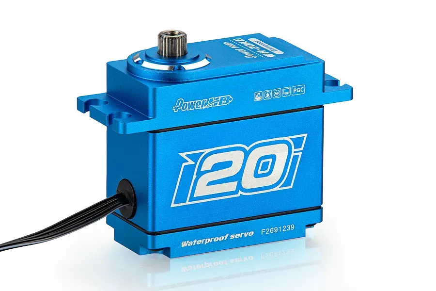 Servos are powered by the ESC's output to the receiver. If you're using a higher-strength servo than the ESC can support (usually greater than 20kg), you may experience 'brown-outs' where the radio signal can be interrupted and cause erratic driving. This can be helped by plugging a Glitch Buster into the receiver smoothing the current delivery. However, in some cases, you may need to install an external BEC. How To: Install a ServoIn this video, Hamish gives a step-by-step guide on installing a Servo and how to avoid stripping your servo gears. Power HD brings a range of crawler specific high-torque & high-voltage servos. With three variants; 40kg/cm, 30kg/cm, & 20kg/cm featuring a waterproof case & wiring system. FeaturesServo case is CNC machined, ensuring higher quality. Customised Power HD waterproofing system. Uses Hardened Steel Gears for extra strength and durability. The 32-bit high-frequency MCU creates more precise operation with locked-rotor & power-on slow-start protection. Casing is anodized in Blue. SpecificationsTorque(6.0V): 15.0 kg-cm (208.3 oz/in). Torque(7.4V): 18.0 kg-cm (250.0 oz/in). Torque(8.4V): 20.0 kg-cm (277.7 oz/in). Speed: 0.11 sec (6.0V) ? 0.09 sec (7.4V) ? 0.08 sec (8.4V). Operating Voltage?6.0 ~ 8.4 DC Volts. Weight: 82.0 g (2.89 oz). Bearing Type?Ball Bearing x 2. Motor Type?Coreless Motor. Gear Type?Titanium & Steel. Operating Temperature?-20?~60? . Working frequence?1520?s / 333hz. Size?40.7 x 20.5 x 38.5 mm (1.60 x 0.81 x 1.52 in). Included itemsDescription. QTY. Blue Aluminium Standard Coreless 20kg 8.4v Steel Geared Waterproof Servo. 1. Hardware Set. 1. Decal Sheet. 1. Power HD WH-20KG Coreless Servo Dimensions Total Height (A ) = 44mm. Body Width (B ) = 40.7mm. Below Mount (C ) = 28mm. Above Mount (D ) = 16mm. Total Length (E ) = 20.6mm. Total Width (F ) = 54.2mm.
