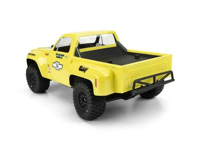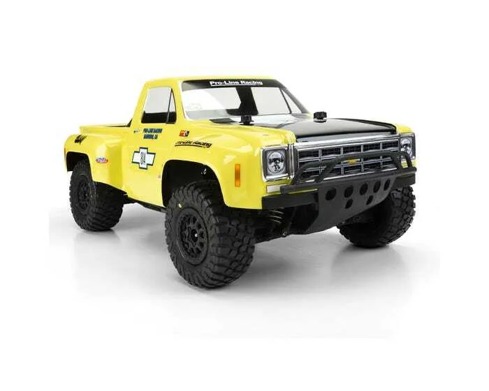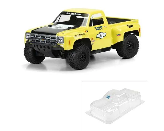 This is a 1978 Chevy® C-10™ Race Truck Clear Body for Short Course. Pro-Line now has the ultimate licensed Chevy® body - the 1978 Chevy® C-10™ Race Truck! This step-side classic truck body features large, full race fenders and styling that will separate your truck from the rest. This well-known and recognizable truck body style won many desert races in the mid to late 70's and was driven by off-road legends Parnelli Jones, Rick Mears and Walker Evans making it the ultimate dream truck to many race fans. The body includes fully licensed Chevy® grill, headlight and taillight decals to complete the look. Give your Short Course Truck the tough look it deserves with Pro-Line's new Chevy® C-10™ body!