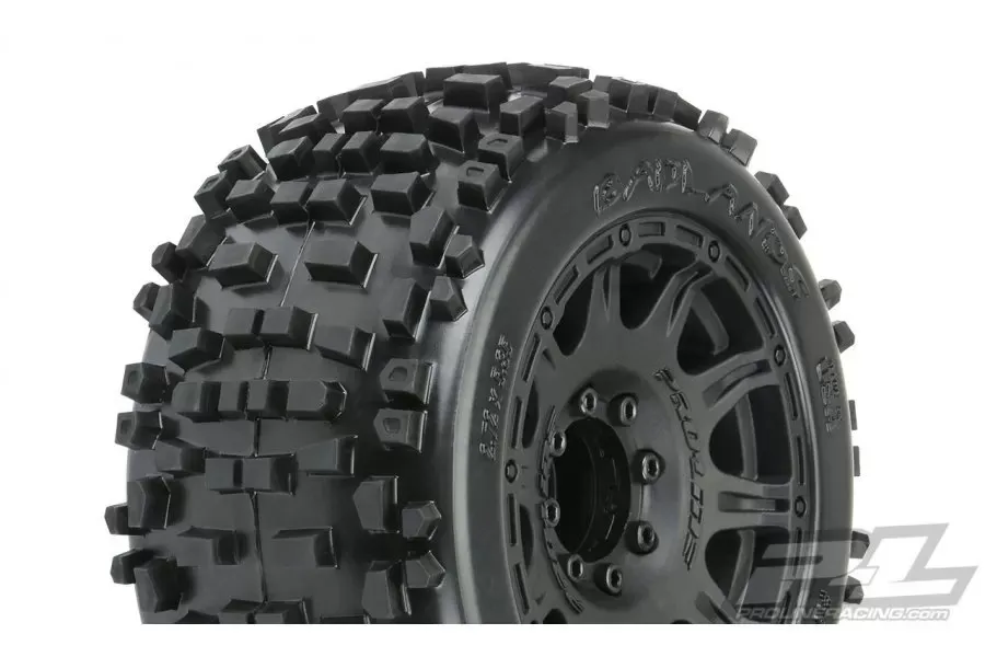 The built-in adjustability and ease of use make this a must-have wheel for bashers everywhere! Be the first to own the latest and greatest technology from Pro-Line, get the pre-mounted Badlands 3.8" tires now! .Please note: All tires & wheels are sold in pairs, unless otherwise noted.PRO117810 | Badlands 3.8" All Terrain Tires Mounted on Raid Black 8x32 Removable Hex Wheels (2) for 17mm MT Front or Rear. MAXX®, E-REVO®, SUMMIT® are registered trademark of Traxxas® L.P.