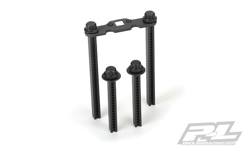 This is an Extended Body Mount Kit with Secure-Loc Caps for the Traxxas Monster Trucks. ..Pro-Line continues to innovate with more must-have..accessories..for your..Monster Truck. The all-new Pro-Line body mount kit includes adjustable body mounts so you can fit any body on your truck perfectly! But, the Pro-Line Engineers did not stop there. Instead of just using the same old flimsy body clips that always get lost and bent, the Pro-Line Extended Body Mount kit includes a revolutionary screw on body mounting system for a strong and secure mount every time. No more getting stabbed in the finger by those nasty clips! Just screw down the included setscrew into the body mount, place the O-Ring over the setscrew and mount your body as you normally would. This new Extended Body mount kit adds safety, security and styling with Pro-Line...s innovative screw on body mounting system! Get your Extended Body Mount Kit for your..REVO.. 3.3,..E-REVO....and..Summit....today!