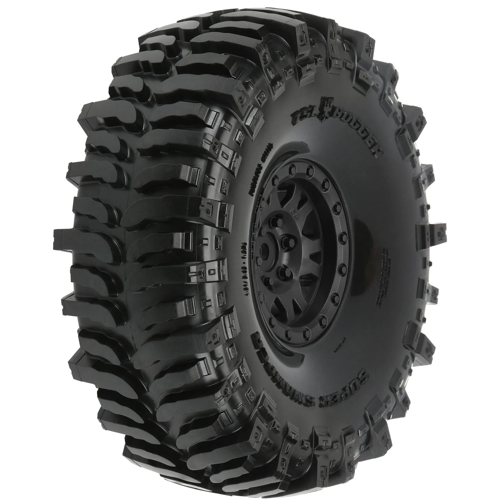 The IntercoÂŽ BoggerÂŽ 1.9" tire comes conveniently pre-mounted to Impulse Black Plastic 1.9" wheels that are Proudly Made in the USA! These Impulse wheels are designed to not only look scale but to be super easy to use by only requiring 6 screws per wheel for mounting tires. The unique 3-piece plastic wheel design bolts together in the back and locks on to Pro-Line's incredible list of 1.9" Crawling Tires.