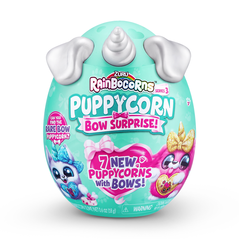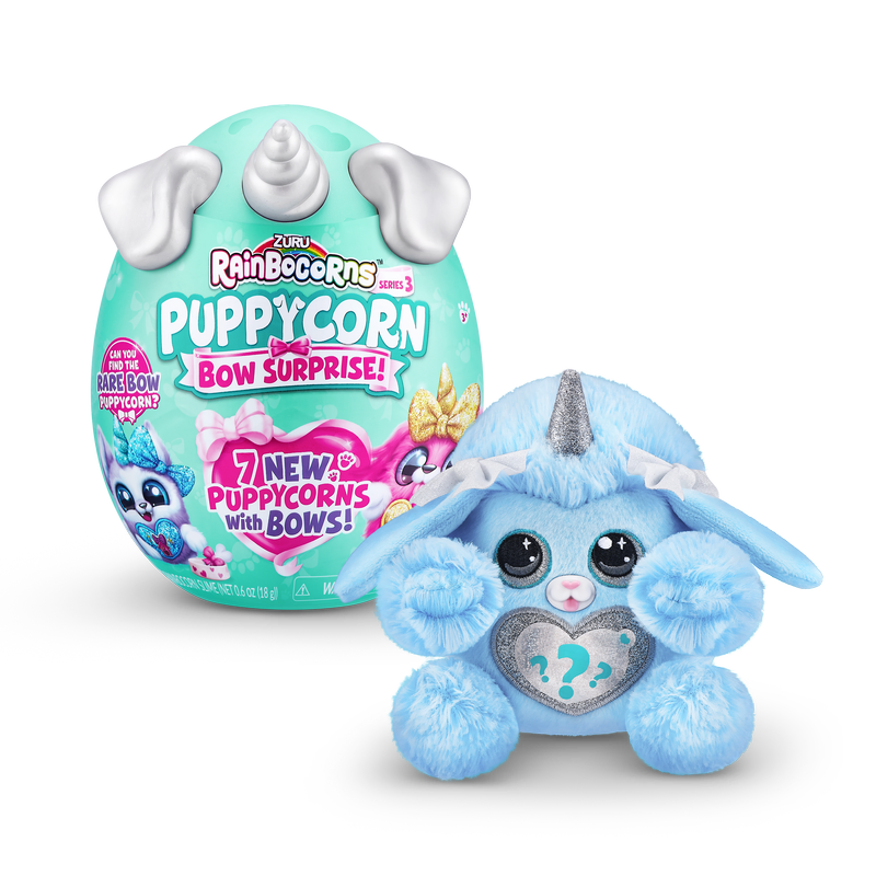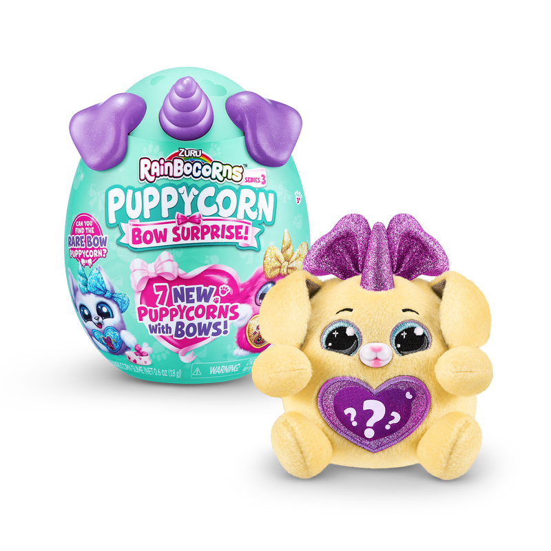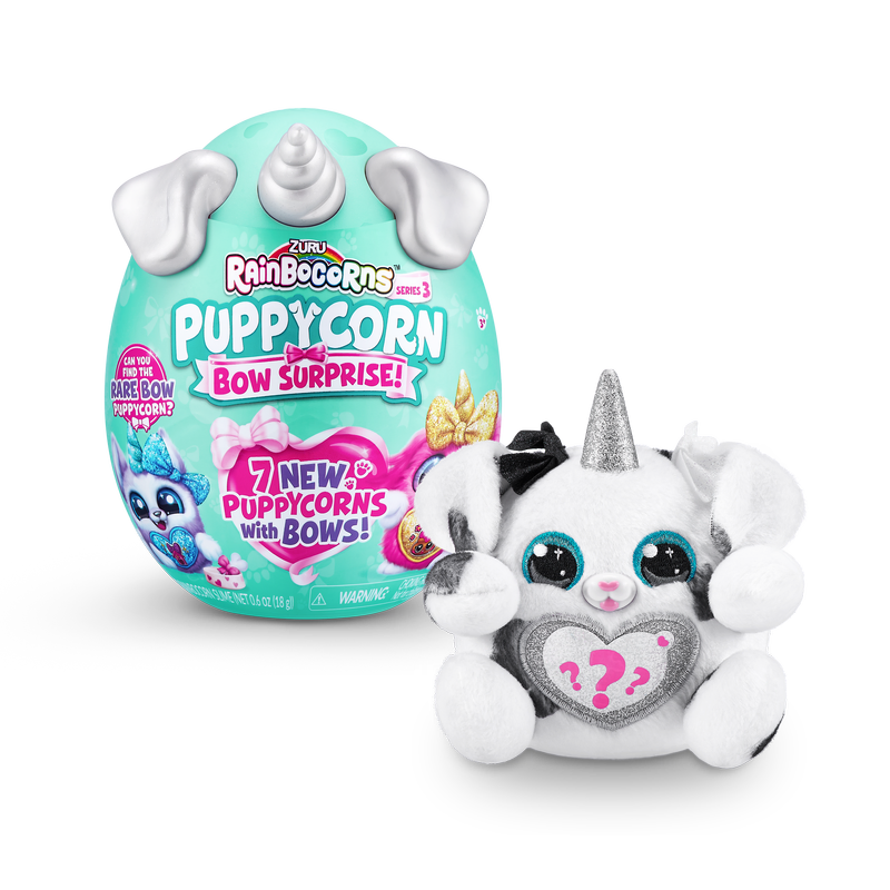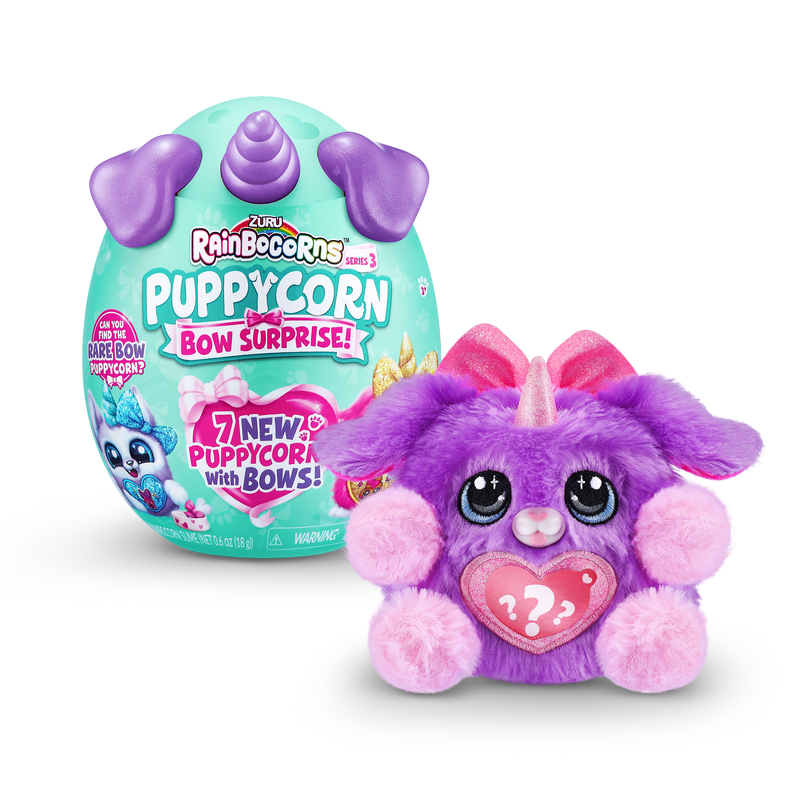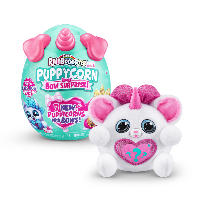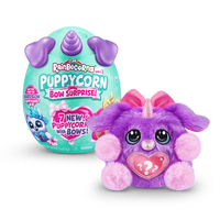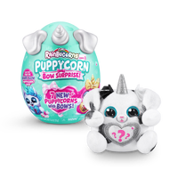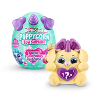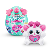 Meet the most bow-utiful Puppycorns in Rainboville, Puppycorns Bow Surprise! These Puppycorns have a passion for fashion and can't wait to be your new furry friend! Use the Peel and Reveal heart to learn what your puppy pal loves and pop open the mini Boo-Boocorn egg to meet their mini me! There's 5 surprises packed inside this Rainbocorns egg, get cracking to meet your new bowed up buddy!