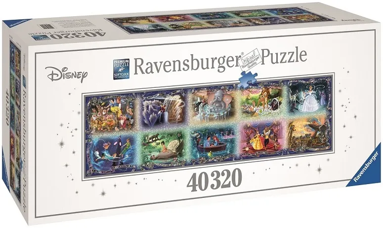 The new biggest puzzle in the world manufactured in a production series measures 6.8 metres long by 1.9 metres tall, which is over 13 square metres! It is made up of exactly 40,320 pieces and shows the ten most popular Disney films of all time in individual but fully linked puzzle panels of 4,032 pieces each. Each panel comes individually bagged.