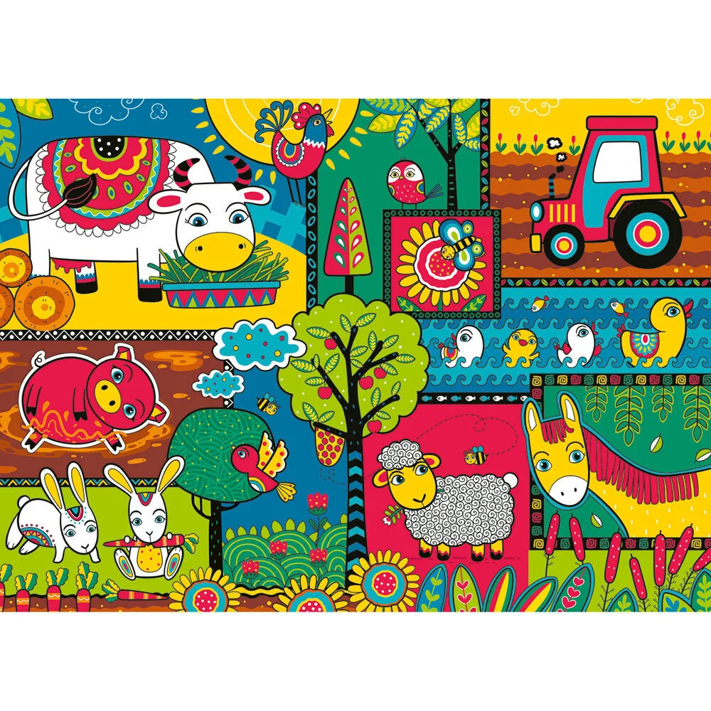 Help your child grow a healthy crop of new skills as they spend “A Day at the Farm” with our 60-piece jigsaw puzzle! Come out to the country and see your child enjoying this colorful collage of scenes in our charming “A Day at the Farm” puzzle! A cow munches on grass, a rooster cries cock-a-doodle-doo, the tractor plows the field, a pig rolls in the mud, ducks swim in the pond, bunnies munch on carrots (the farmer won’t like that!), and the sheep and horse graze in the fields. This sweet puzzle provides a fun way for children to develop hand-eye coordination, fine motor skills and problem-solving! Specification - Puzzle Size: 36 x 26 cm - Puzzle Pieces: 60