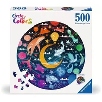 Escape into your peaceful zone where all is well in the world and let your “Dreams” put life’s puzzle pieces in place! Solve this jigsaw puzzle and find out where your “Dreams” take you! A crescent moon is surrounded by stars, planets and animals from above and below the sea. Enjoy hours of stress-reducing satisfaction as you imagine yourself floating away in the hot air balloon. Worked in the round, this circle-shaped puzzle cuts the corners but not the exceptional puzzle experience you’ve come to rely on from Ravensburger. Makes a great gift for your favorite dreamer or anyone up for a unique puzzle challenge! Part of our Circle of Colors series, this 500-piece jigsaw puzzle combines captivating imagery with clean-cut pieces and Ravensburger’s perfect interlocking fit for a most pleasurable puzzling experience! Our puzzles are crafted with an exclusive, extra-thick cardboard backing along with our superior, linen-structured paper, so the printed image is vibrant, crisp, and glare-free. Create memorable moments with Ravensburger premium puzzles! Made in Czech Republic. Specifications - Pieces: 500 - Dimensions: 52 cm diameter