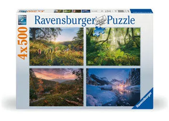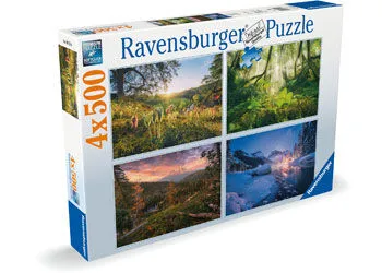 4 Ravensburger Puzzles 500 pieces in a box! Enjoy beautiful photo images of the four seasons: Spring in Bavaria, Germany; Summer in the Olympic National Park, USA; Autumn in California and Winter in the Rocky Mountains, Canada.