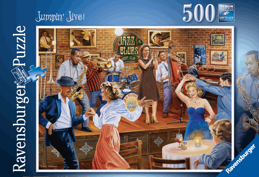 This lively and atmospheric scene shows the resident 6-piece band playing, people dancing, and everyone having a great time. Couples are dancing the jive (ideal for a small dance floor) and the saxophone player is making the most of his solo. Behind our band, the walls are decorated with photos and posters of jazz and blues greats. The puzzles title was inspired by Cab Calloways song of the same name. Specification - 500 Pieces - Completed puzzle measures 49 x 36cm