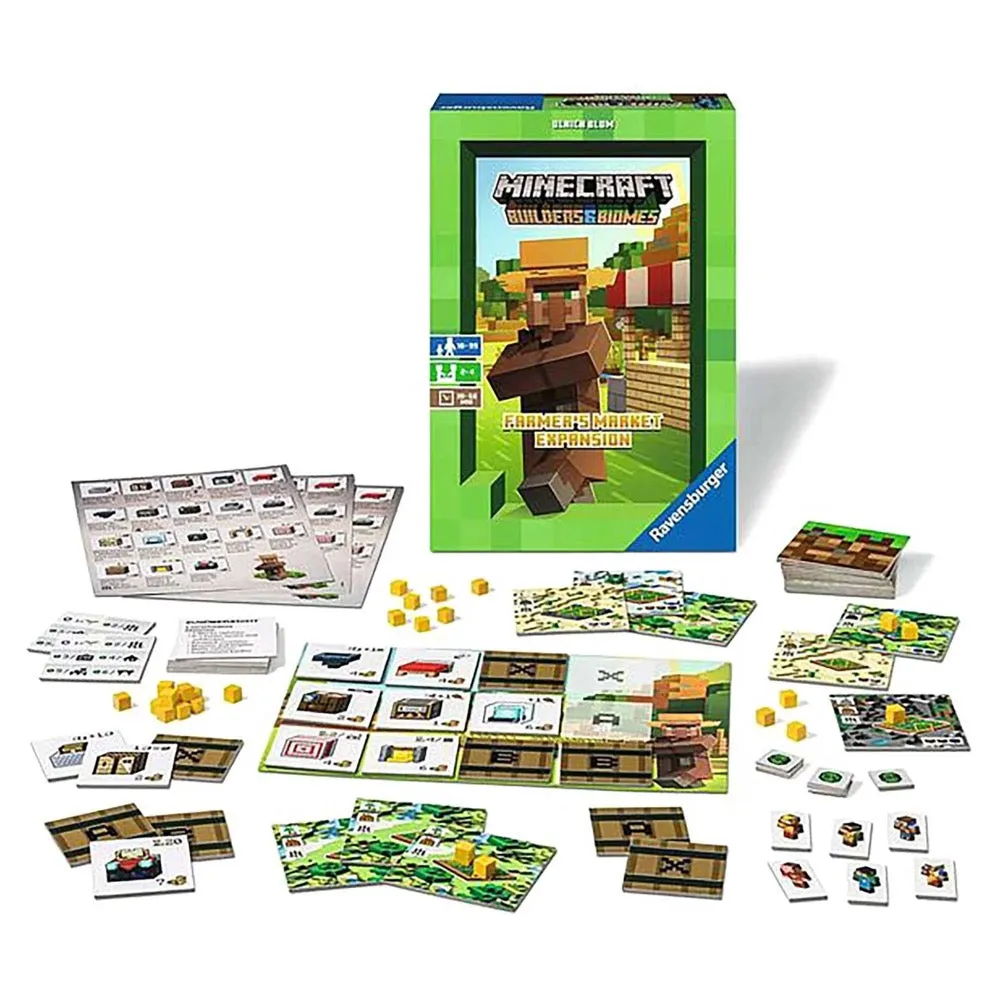 Farm your land and take your vegetables to the farmers market where you can trade with villagers for unique items with powerful abilities! The Farmers market expansion can only be played with the Minecraft: Builders and Biomes base game. For 2 - 4 players aged 10+. Playing time around 30 - 60 minutes. Includes - x20 building tiles - x1 marketplace board - x18 item tiles - x32 vegetable tokens - x6 player skins - x3 item reference cards - x8 overview cards - x8 experience counters