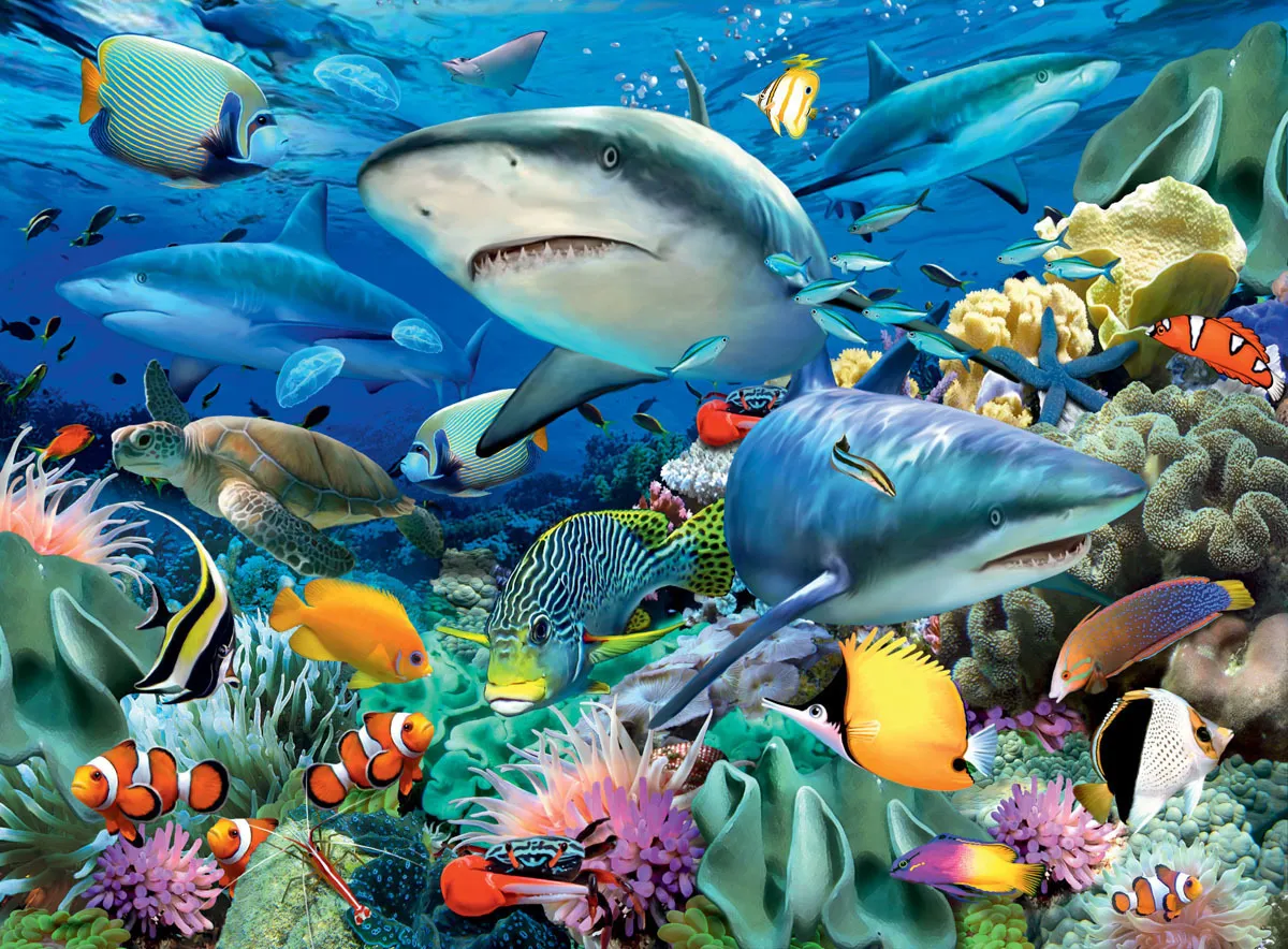 This is the Ravensburger Reef of the Sharks Puzzle 100pc • Our stunning ocean & seas puzzles are designed to inspire and thrill every little puzzler. You will find all kinds of fascinating sea creatures. There is a Ravensburger ocean puzzle for every curious kid!