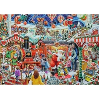 Featuring a stunningly detailed festive illustration, Santa sits in his enchanting grotto, with his majestic steam train behind him and two of his faithful reindeer by his side. The scene is set within a luxurious shopping centre, beautifully adorned with twinkling lights, garlands, and vibrant decorations. Excited children and families eagerly wait their turn to meet Santa and share their Christmas wishes, while shoppers bustle around, soaking in the festive atmosphere. A delightful challenge for puzzle enthusiasts and a perfect Christmas gift for lovers of the festive season.