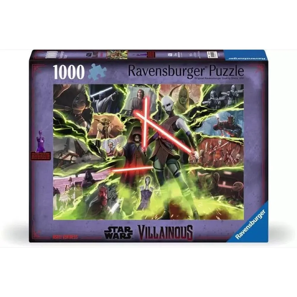 Count on double lightsabers for twice the fun puzzling our “Star Wars™ Villainous: Asajj Ventress” collage, where Dooku is doomed! Taken as a child from her Dathomirian Nightsisters, forced into servitude, raised and mentored by a Jedi, then becoming an assassin of the Sith, force-sensitive Asajj Ventress serves as Count Dooku’s apprentice. When Palpatine becomes wary of her growing Force strength, he orders Dooku to eliminate her. In this alternate storyline, Mother Talzin’s dark powers kill Dooku. Asajj Ventress becomes Palpatine’s new apprentice, continuing her path on the Dark Side and taking her game mover with her! Part of the “Star Wars™ Villainous” series and complement to Ravensburger’s “Star Wars™ Villainous: The Power of the Dark Side” game, this highly-collectible puzzle is strong with the Force to provide hours of fantastical fun! Specifications - Pieces: 1000 - Dimensions: 70 x 50 cm