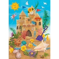 Bring the beach indoors with our “Sunshine Sandcastle” jigsaw puzzle for hours of summer fun anytime of the year! Light up your little one’s day with our “Sunshine Sandcastle” puzzle and watch them warm up to screen-free fun! This whimsical scene features a sandcastle decked out with shells, flags and more plus a cute crab standing guard. A large conch shell, scallops and a friendly starfish are scattered nearby, while seagulls, a dragonfly and smiling sun fill the sky. Jigsaw puzzles help develop hand-eye coordination, fine motor skills and problem-solving while delivering tons of fun all year round! This 35-piece puzzle has extra-large, durable pieces little hands can easily hold on to for lots of repeat fun. Clean-cut pieces and Ravensburger’s tight interlocking fit provide a pleasurable puzzling experience for children and their adult helpers alike. With piece counts children can grow with, our Perfect Age Fit criteria ensures this puzzle is fun and educational! About the Artist: Watching a budding amusement park transform her neighborhood in Southern California cemented Kathy Kehoe Bambeck’s vision of becoming an artist at age 5. That park was Disneyland! Fascinated by visual details, Kathy mentally sketched the houses, trees and flowers she saw as she walked 2 miles to school each day. Kathy shares, “Art lifts, makes life sparkle, entertains, teaches, and makes us laugh. It reminds us that we are more.” Specifications - Pieces: 35 - Size: 29 x 21 cm
