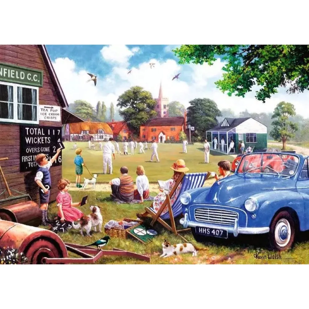 This is the fourth in a series of nostalgic scenes, each highlighting popular ways to spend your leisure time. What better way to spend a sunny Sunday afternoon than by enjoying the local cricket match? You can pack your deckchairs into the car, take a picnic, watch the match and listen to the sound of leather on willow. Even if you're not that much of a fan, you can always take a book and just enjoy the beautiful surroundings and the summer weather. It may even inspire dreams of a glorious sporting future! Wind down from daily chores and pressures and enjoy some mindful moments as you assemble this calming and nostalgic jigsaw puzzle. Specifications - Number of pieces: 1000 - Dimensions: 70 x 50 cm
