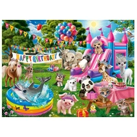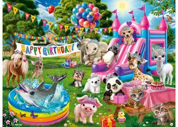 Get fancy, put on your bling, join the fun and get ready to sing! It’s our “Tiara Birthday Party” jigsaw puzzle! Give your child a gift with lots of repeat fun with our “Tiara Birthday Party” puzzle, set under the sun! All the animals are decked out in their finest jewels, even the dolphin swimming in the cool little pool. The piggy, panda and polar bear are hoping for cake, while giraffe (who missed his nap) can hardly stay awake! Puppy and penguin are going down the slide, and pony would be happy to give you a ride. In the middle is a cute little pup, who knows this puzzle is great! Specification - Puzzle Size: 49 x 36 cm - Puzzle Pieces: 100