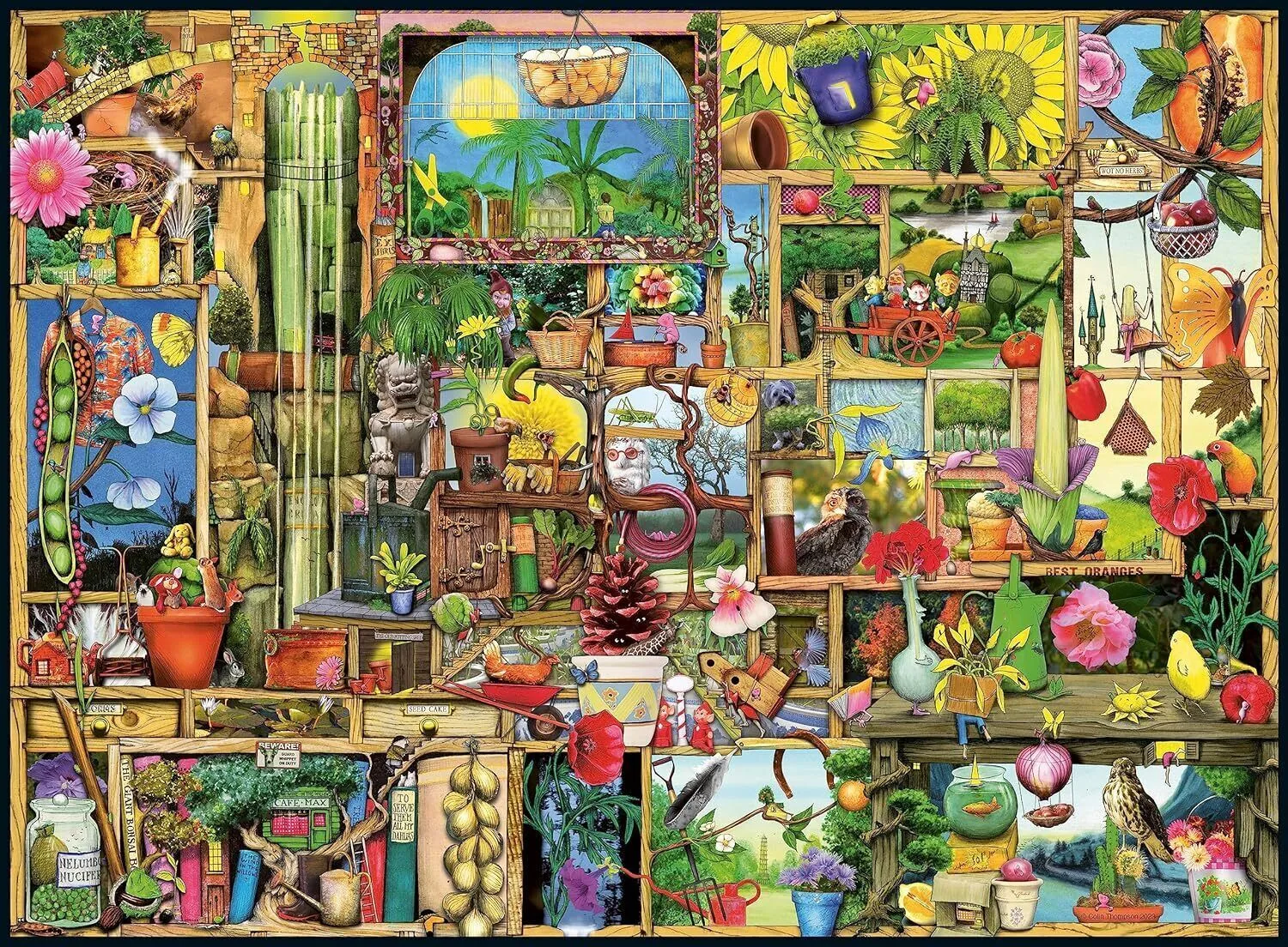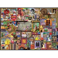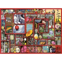 Step into the extraordinary and enchanting universe of Colin Thompson with this captivating collection of four 500 piece jigsaw puzzles, all bundled together in one box. Get ready to embark on a journey through the bizarre and wonderful world created by the brilliant artist himself. Unveil the mysteries hidden within ""The Red Box"" puzzle, where you'll find yourself surrounded by an array of curiosities, oddities, and peculiar artifacts. Next, explore the depths of ""The Kitchen Cupboard"" puzzle, where chaos and creativity intermingle. As you move on to ""The Gardener's Cupboard"" puzzle, be prepared to enter a whimsical world of flourishing greenery and peculiar plant life. Finally, unlock the mysteries of ""The Craft Cupboard"" puzzle, a treasure trove of creativity and imagination. Specification - No. of Pieces: 4 x 500 - Puzzle size: 49 x 36cm - Age: 12+