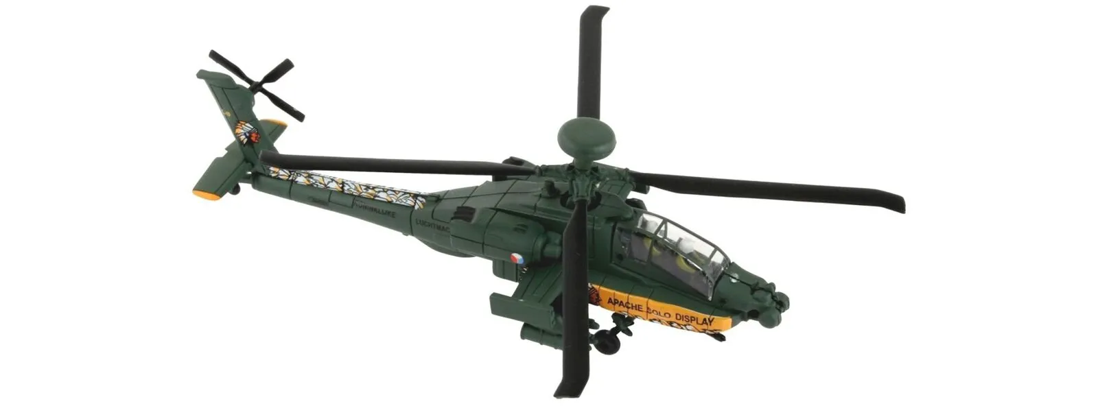 Movable main rotor: Gives dynamic representations to the model. - Laser and sensor system: Recreated in detail. - Cannon on the front fuselage: Underlines the combat readiness of the Apache. - Authentic decals: Representation of the Apache of the 3/227th Aviation Regiment possible.