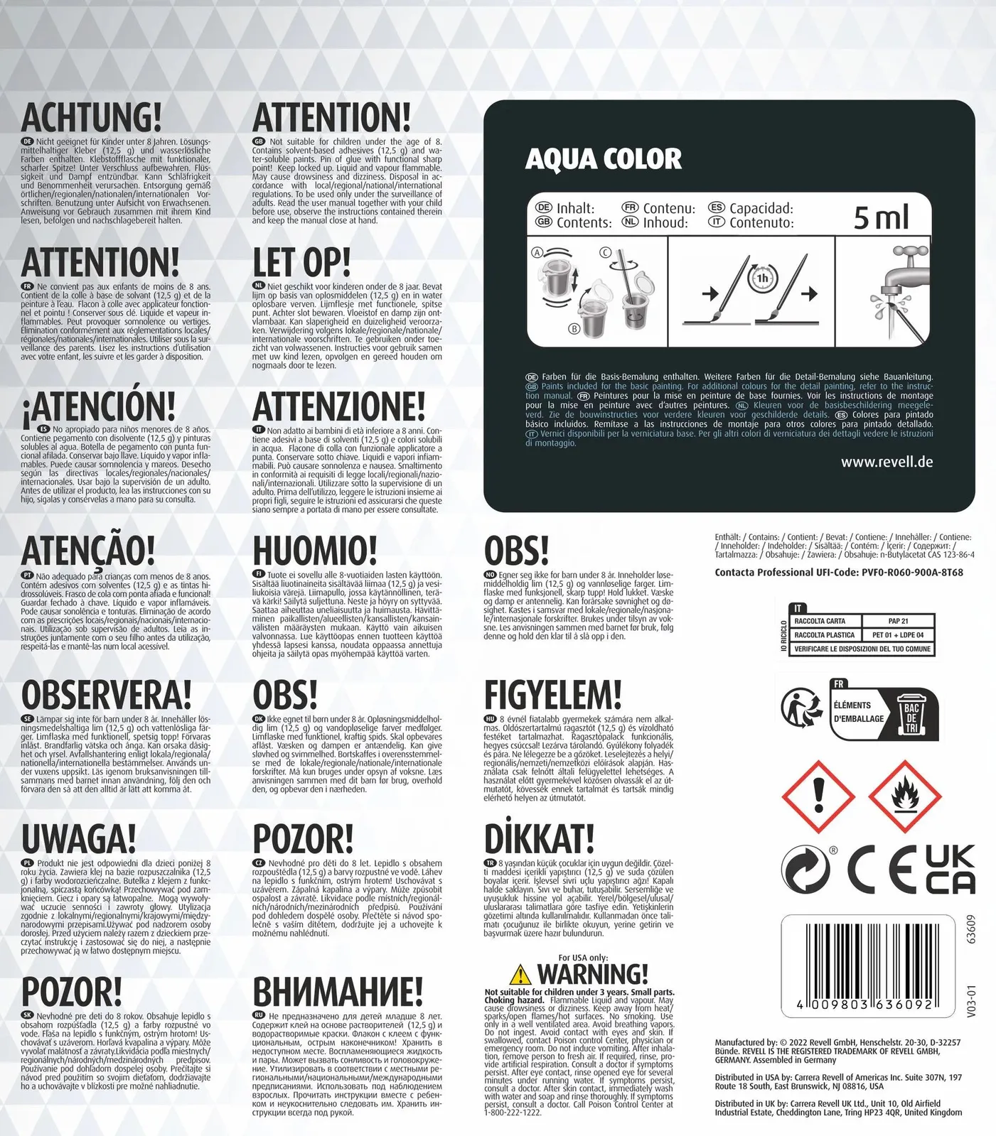 Caution. Not suitable for children under 8 years. Contains solvent-based glue (contains n-butyl acetate, 12.5 g) and water-soluble paints. Glue bottle with functional, sharp tip! Keep under lock and key. Liquid and vapor flammable. May cause drowsiness and dizziness. Dispose of in accordance with local / regional / national / international regulations. Use under adult supervision. Read and follow instructions before use with your child and keep ready for reference.