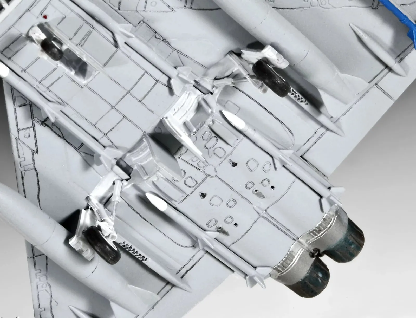 The model kit impresses with its new kit shape and finely structured surfaces with recessed "sheet metal joints". It also has a detailed cockpit, detailed landing gear as well as two external tanks and eight guided missiles (4 METEOR, 4 AMRAAM, 2 IRIS-T and 2 ASRAAM). Two decal versions are also included: German Air Force and RAF.
