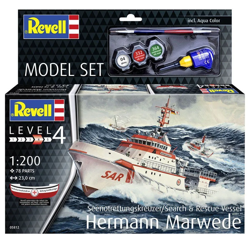 Model kit of the HERMANN MARWEDE, the largest search and rescue vessel of the German Maritime Search and Rescue Service (DGzRS): 46 metres long, 9,250 hp, 25 knots fast, stationed on the island of Heligoland. The DGzRS is responsible for search and rescue on the North Sea and Baltic Sea. voluntary, independent, funded by donations. . Detailed two-part hull with bow thrusters. All-round railing. Detailed deck superstructure In addition to basic colours, adhesives and brushes are also included.