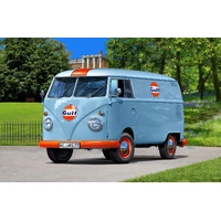 From the 1950s, the T1 Transporter was produced with its typical V-shaped front end and split windshield. The unladen weight of the Transporter used by many companies was 975 kg and the payload 750 kg. For many, the legendary light blue-orange of the sponsor Gulf Oil, which became internationally known for its successful involvement in motor sports in the 1960s and 1970s, is the most attractive paint scheme for the vehicle. Multicomponent body Movable side doors Rotating wheels Kit for experienced modelers In addition to basic colours, adhesives and brushes are also included.