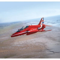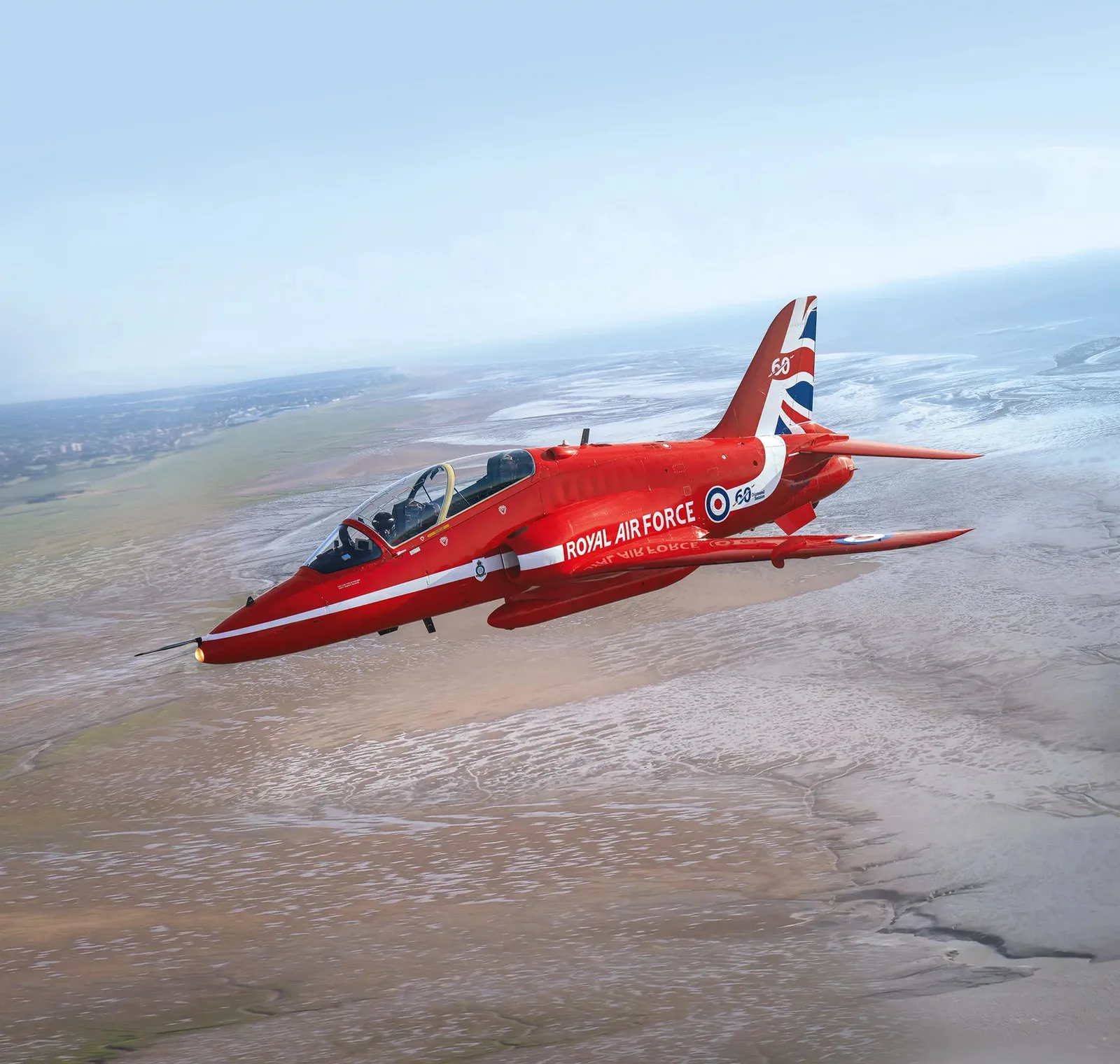 The BAe Hawk T.1A has been the Red Arrows' training aircraft since 1979. The team has made a name for itself worldwide with its spectacular formation flights and precise maneuvers. The characteristic red and white paintwork and the smoke trails in the sky are the trademark of the aerobatic squadron. For the 60th anniversary in 2024, the team presents itself with a special paint job, which is faithfully reproduced in this model.