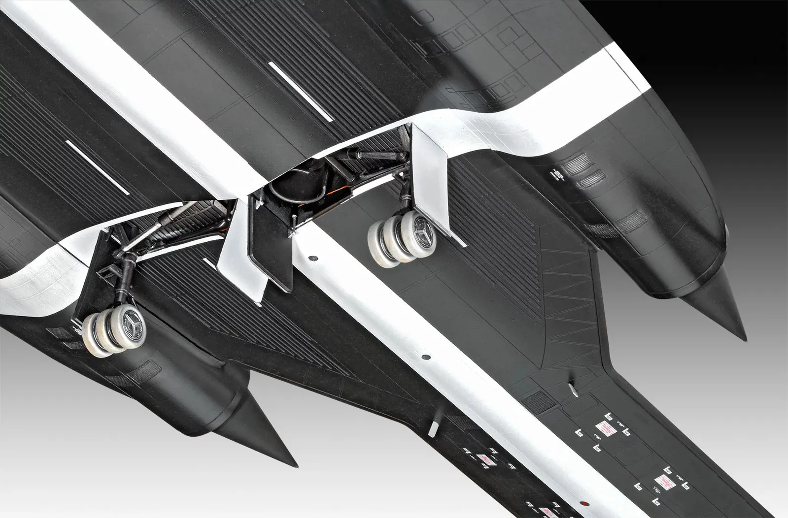 The SR-71 Blackbird model kit is characterized by its detailed J58 engines, two different nose segments and authentic cockpits. All of these elements contribute to making the model as realistic as possible and providing an authentic replica experience.