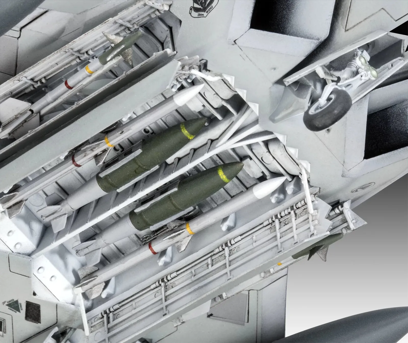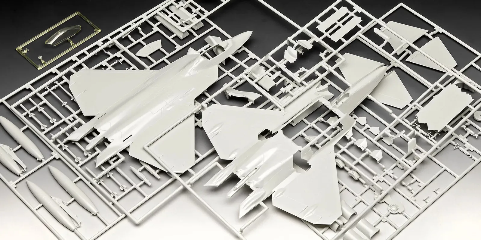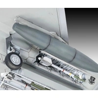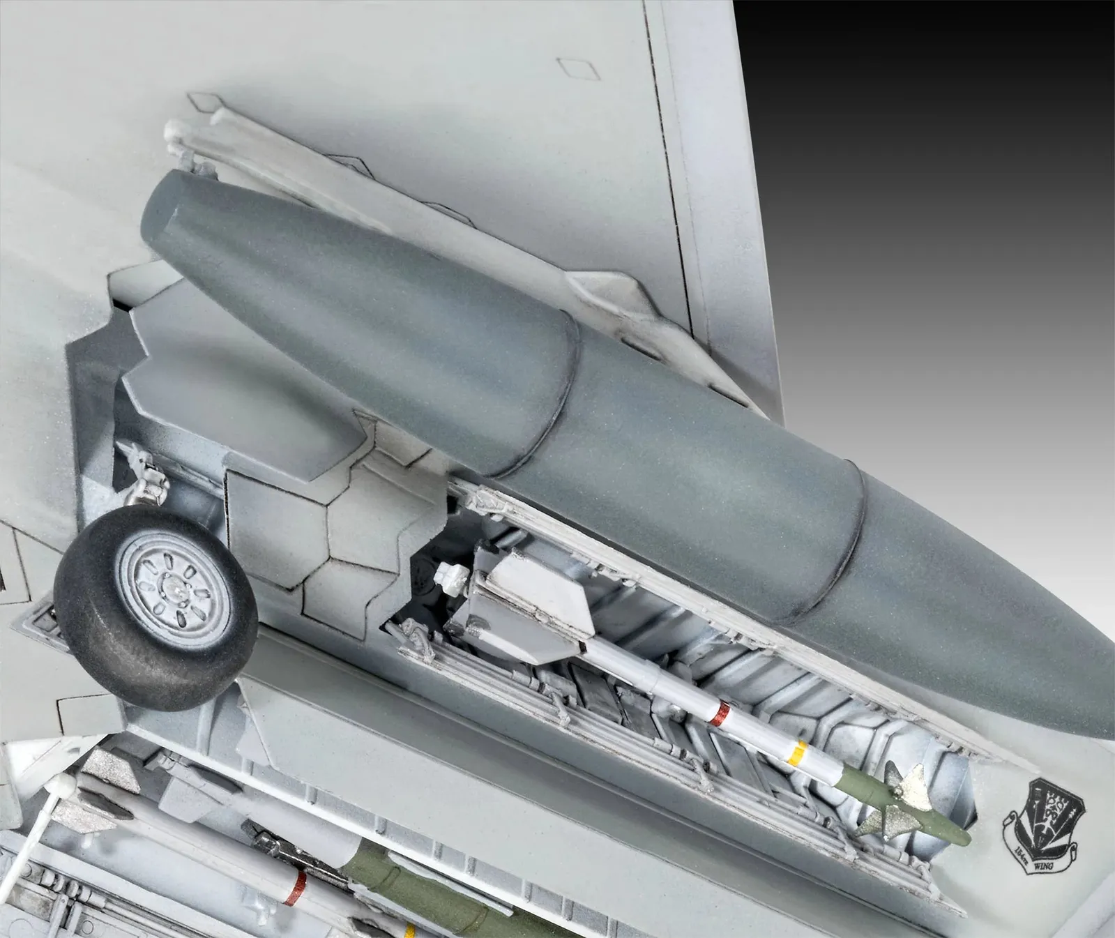 In addition to the unassembled model, the kit includes illustrated, multilingual assembly instructions and decals to personalize your model. In addition, you get a detailed cockpit, detailed landing gear, detailed air intake and thruster area, three detailed weapon bays, additional tanks and two GBU-32 bombs for ultimate building pleasure.