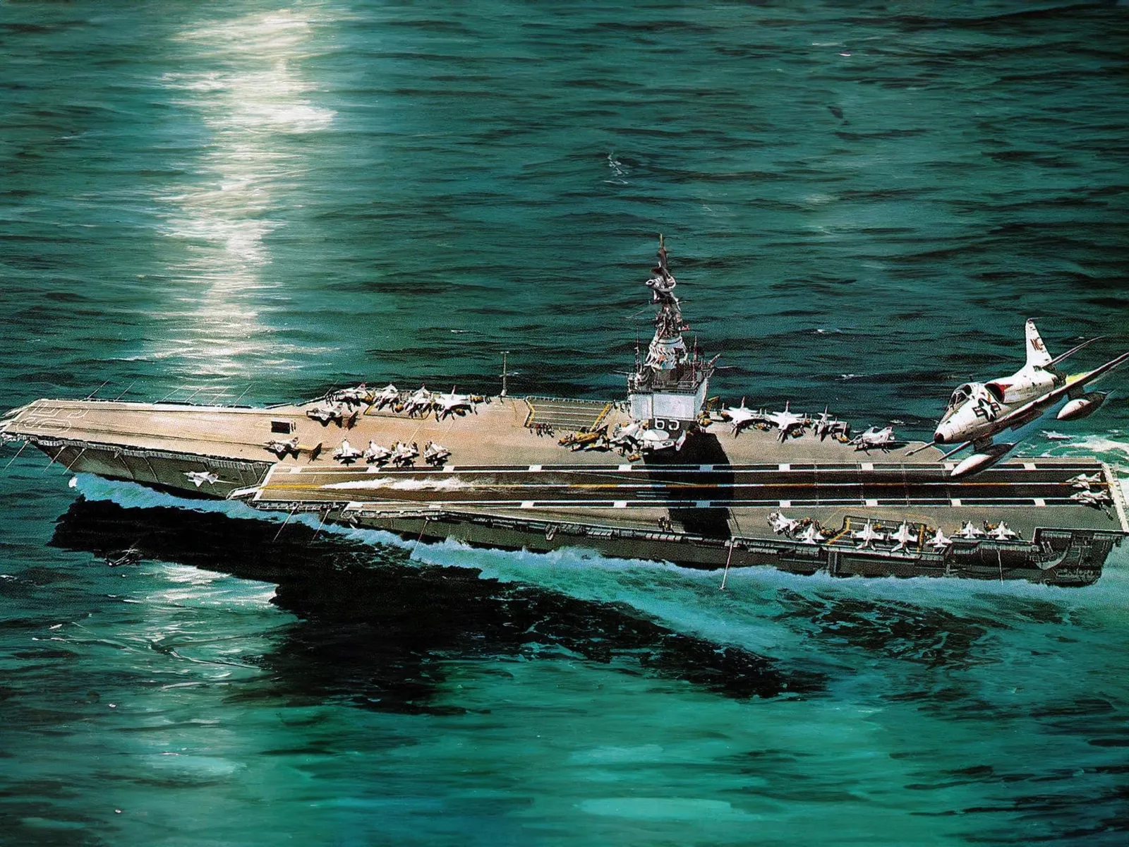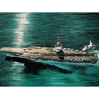 The nuclear powered Enterprise is the first aircraft carrier of its kind and counts among the largest vessels ever built. The gigantic aircraft was put into service on 25 November 1961. Eight water-cooled reactors generate a total power output of 300,000 HP, with which the vessels achieves an average speed of 35 knots. She displaces 75,700 tons. The aircraft deck measures 76.8 m in width. On average there are 414 officers and 4260 crew on board. Since her nuclear power system makes the Enterprise independent of external supplies, it was possible to provide large fuel depots for the ships aircraft. The largest and most modern aircrafts of the US Navy can be operated from the Enterprise.