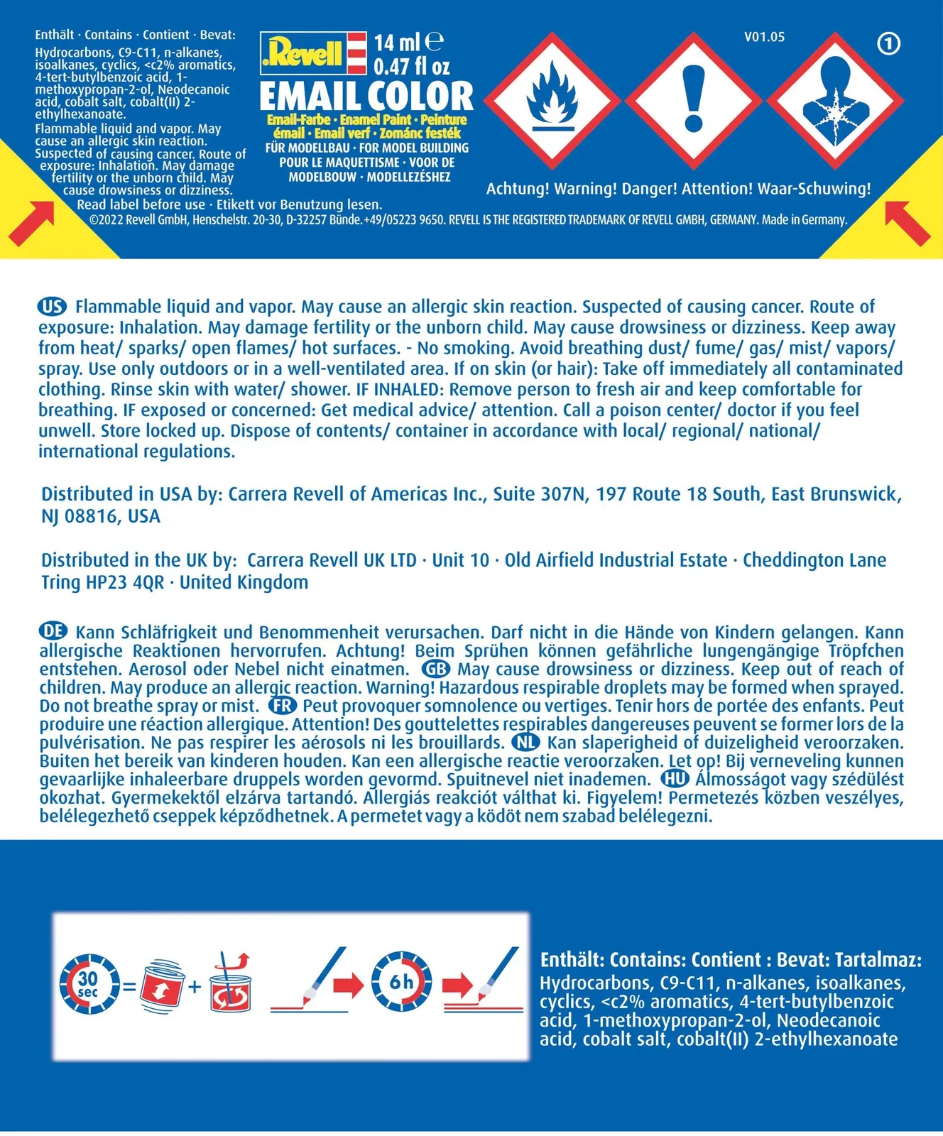 Revell Color is a synthetic resin enamel paint that does not attack the plastic surface of plastic models. The 14 ml paint can, which is popular with many hobbyists, can also be used to paint many other materials. All colors - except signal color - can be mixed with each other and can be diluted with 'Revell Color Mix'. This means that the paint can be applied not only with a brush, but also with a spray gun. The cleaning agents used are 'Revell Painta Clean' for the brushes and 'Revell Airbrush Clean' for the spray gun.