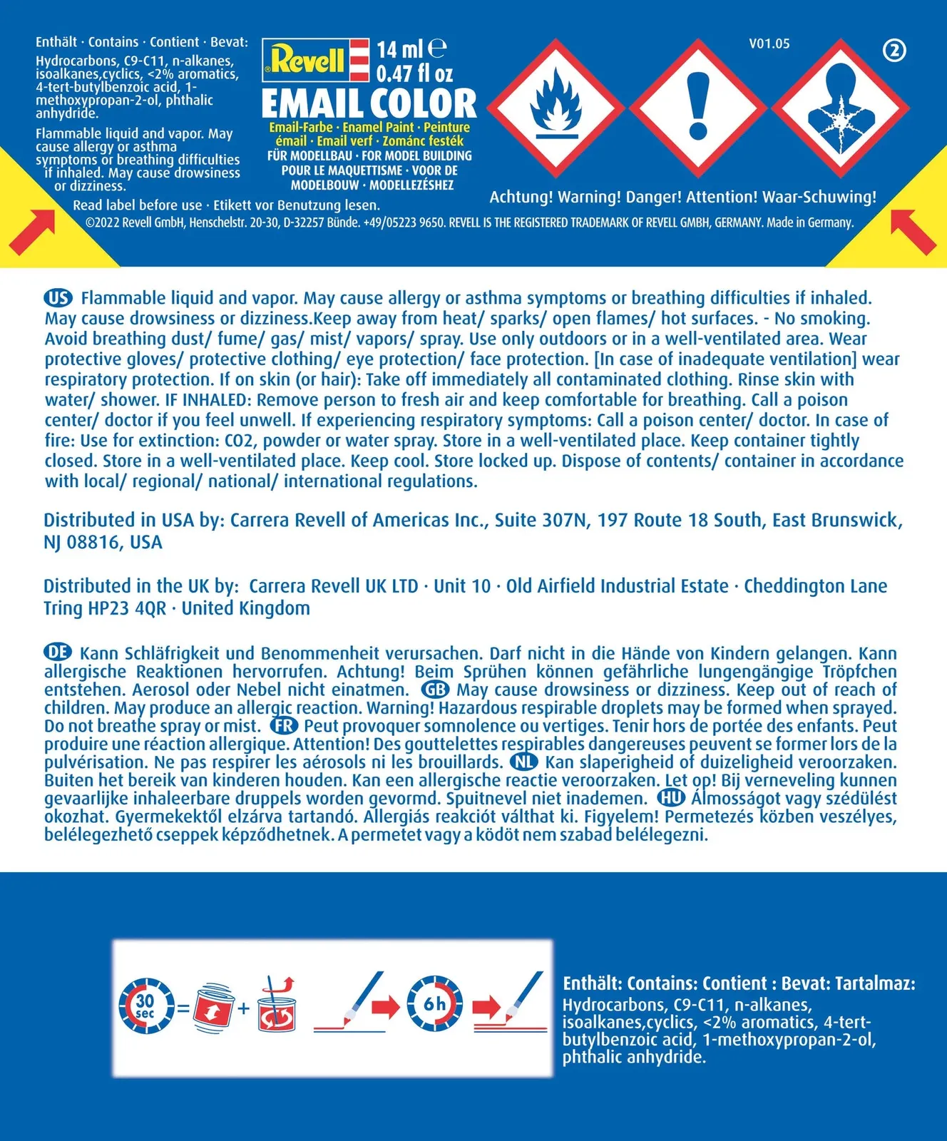 Revell Color is a synthetic resin enamel paint that does not attack the plastic surface of plastic models. The 14 ml paint can, which is popular with many hobbyists, can also be used to paint many other materials. All colors - except signal color - can be mixed with each other and can be diluted with 'Revell Color Mix'. This means that the paint can be applied not only with a brush, but also with a spray gun. The cleaning agents used are 'Revell Painta Clean' for the brushes and 'Revell Airbrush Clean' for the spray gun.