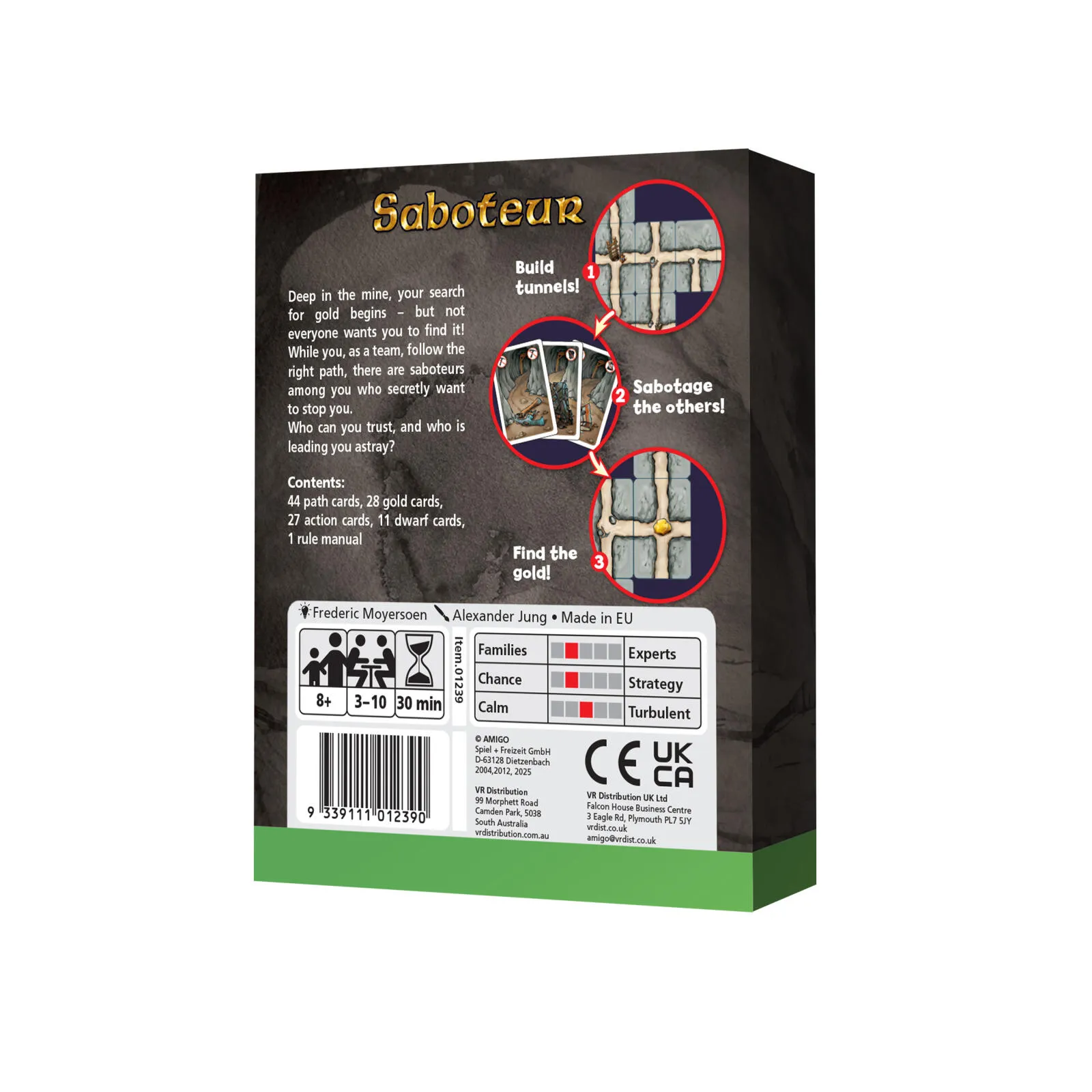 Players take on the role of dwarves. As miners, they are in a mine, hunting for gold. Suddenly, a pick axe swings down and shatters the mine lamp. The saboteur has struck. But which of the players are saboteurs? Will you find the gold, or will the fiendish actions of the saboteurs lead them to it first? After three rounds, the player with the most gold is the winner.