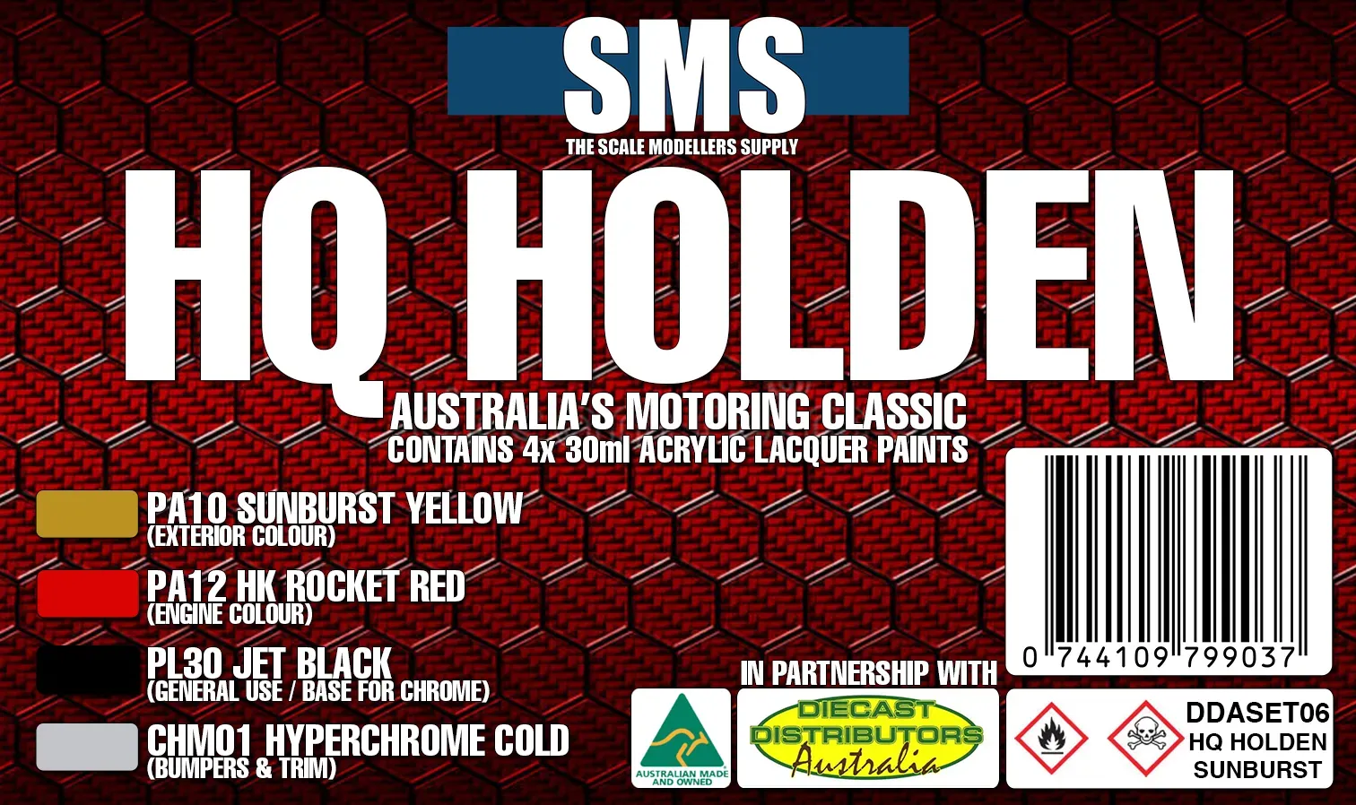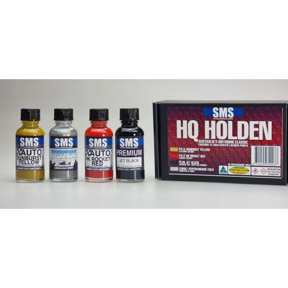 Scale Modellers Supply (SMS) Premium Acrylic Lacquer — Australian-made premium lacquer for scale models. Outstanding coverage, buttery-smooth finish, excellent adhesion. Pre-thinned for airbrush — spray direct from bottle. 30ml bottle.
