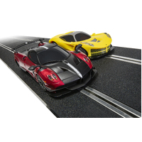 The Scalextric Rasio takes on the elegant Pagani Huayra Roadster BC in this Street Cruisers race set. This set features everything you need to start your racing career, including: 2 easy speed limiting hand controllers, 2 crash resistant cars and over 4.8 meters of track which creates 4 track layouts.