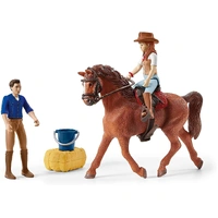 “Hey dad, where are we headed on our road trip?” With the Horse Adventures playset from schleich®, the destination is anywhere your imagination can travel – a riding tournament in the mountains, a horseback camping adventure, a trip to grandma’s ranch or a ride on the moon. This equestrian road trip playset is part of the schleich® HORSE CLUB collection. It includes a HORSE CLUB Hannah figurine (and dad, too!), an authentic Holsteiner mare figurine, an SUV and trailer, plus more than a dozen accessories for storytelling rich in imagination and detail. schleich® HORSE CLUB playsets and figurines introduce the limitless possibilities of storytelling and imaginative play. Featuring dozens of toy horses, riders and accessories, schleich® HORSE CLUB lets your adventure stories run wild. Horse figurines canter in rich detail, while authentic playsets provide an always expanding setting for the adventures of Hannah, Sofia, Lisa and Sarah! Our horse and rider figurines love to be whisked away into stories featuring other schleich® play worlds, from the grasses of the savannah to the majestic pines of the forest! schleich® toys and playsets are built to last for generations. All our toys meet the highest national and international safety standards.