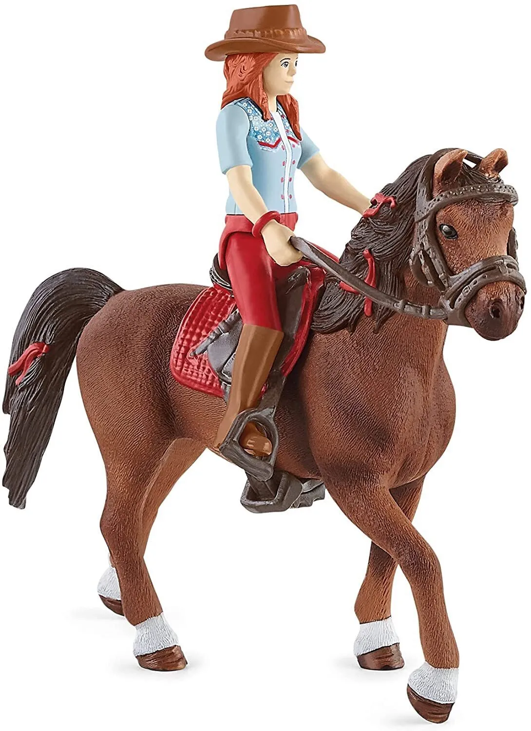 Horse Club Hannah & Cayenne from the Schleich® Horse Club include the fully movable Hannah figurine with cowboy hat, her loyal quarter horse gelding Cayenne, plus a bridle and saddle.