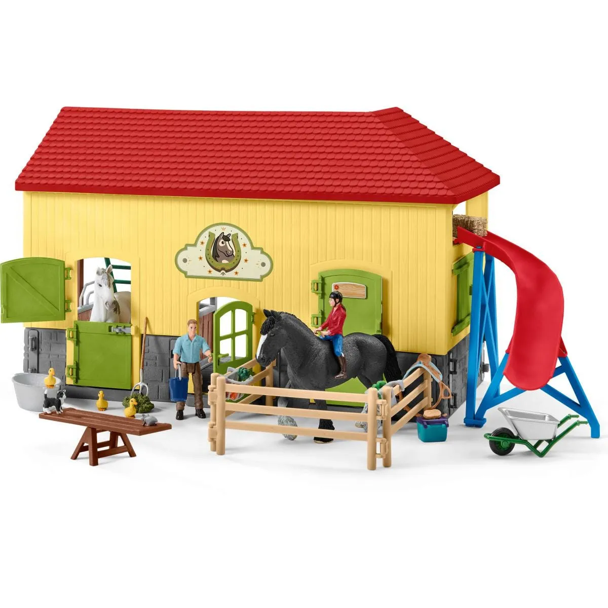 1x Shire mare, 1x Shire stallion, 3x Ducklings, 1x Kitten, 1x Mouse, 1x Farmer, 1x Farmer's wife, 1x Saddle, 1x Horse stable, 1x Feed chute, 1x Seesaw, 1x Trough, 4x Paddocks, 1x Ladder, 1x Apple (green), 1x Carrot, 1x Hay bale, 1x Grass pile, 1x Pitchfork, 1x Bucket, 2x Feeder, 1x Curry comb, 1x Cleaning box, Sticker, 1x Feed indicator
