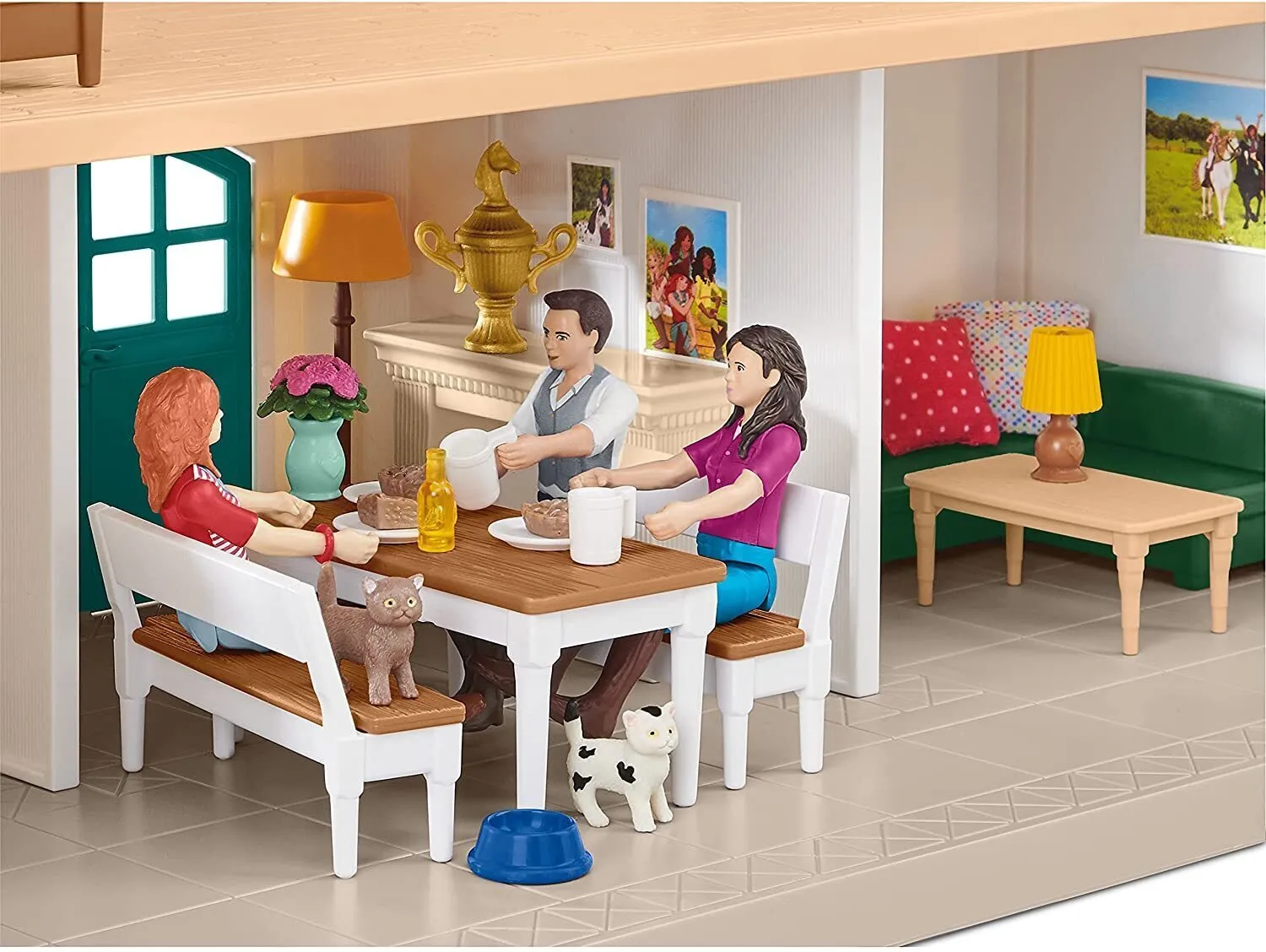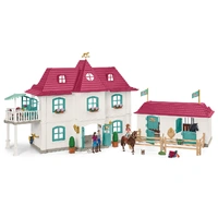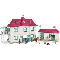 The Lakeside Country House and Stable from Schleich® Horse Club is a big house with fully equipped horse stable and lots of accessories. This is where Hannah and her family live and care for their loyal horses, quarter horse Cayenne and Hanoverian stallion Jupiter. • The center of the Horse Club world with lots of play functions! The Lakeside ranch is the ideal starting point for any Horse Club adventure. • With many fantastic and complex ways to play. The perfect home for Hannah, her family and, of course, a lot of horses. • The figurines are fully movable! • Schleich® figurines are modelled in the finest detail to help children learn while they play. • This item is part of the Horse Club theme world and is suitable for children aged 5-12. Content 1x house, 1x horse stable, 1x balcony, 1x Hannah, 1x Mrs Kramer, 1x Mr Kramer, 1x Quarter horse Cayenne, 1x Hanoverian mare Jupiter, 2x kittens, 1x double bed with mattress, 2x bunk bed with mattresses, 1x bunk bed ladder, 4x fabric blankets, 6x fabric pillows, 1x nightstand, 1x bedside lamp, 1x toilet, 1x sink, 1x shower, 2x benches, 1x sink cupboard, 1x refrigerator, 1x pot, 1x pan, 1x fruit box, 4x bottles, 4x plates, 4x cups, 4x slices of apple cake, 1x dining table, 1x dresser, 1x stairs, 1x fireplace, 1x wood pile, 1x floor lamp, 1x suitcase, 1x telescope, 2x balcony chairs, 1x balcony table, 1x parasol, 3x flower box with flowers, 1x coffee table, 1x sofa, 1x flower pot, 1x bouquet of flowers, 1x cat bowl, 1x golden key, 1x carrot, 1x oven, 2x hay racks, 2x troughs, 2x saddle racks, 4x paddocks, 1x grooming box, 1x curry comb, 1x grooming brush, 2x apples, 1x pitchfork, 1x saddle, 1x reins and bridle, 2x hay, 3x champion's ribbons, 1x cup, 2x boxes in a tub, 1x weather horse, 2x flags, 1x well, 1x hose holder with water hose, 1x sticker, 1x assembly instructions
